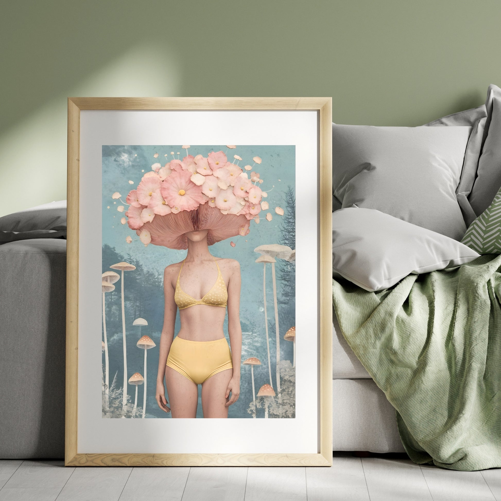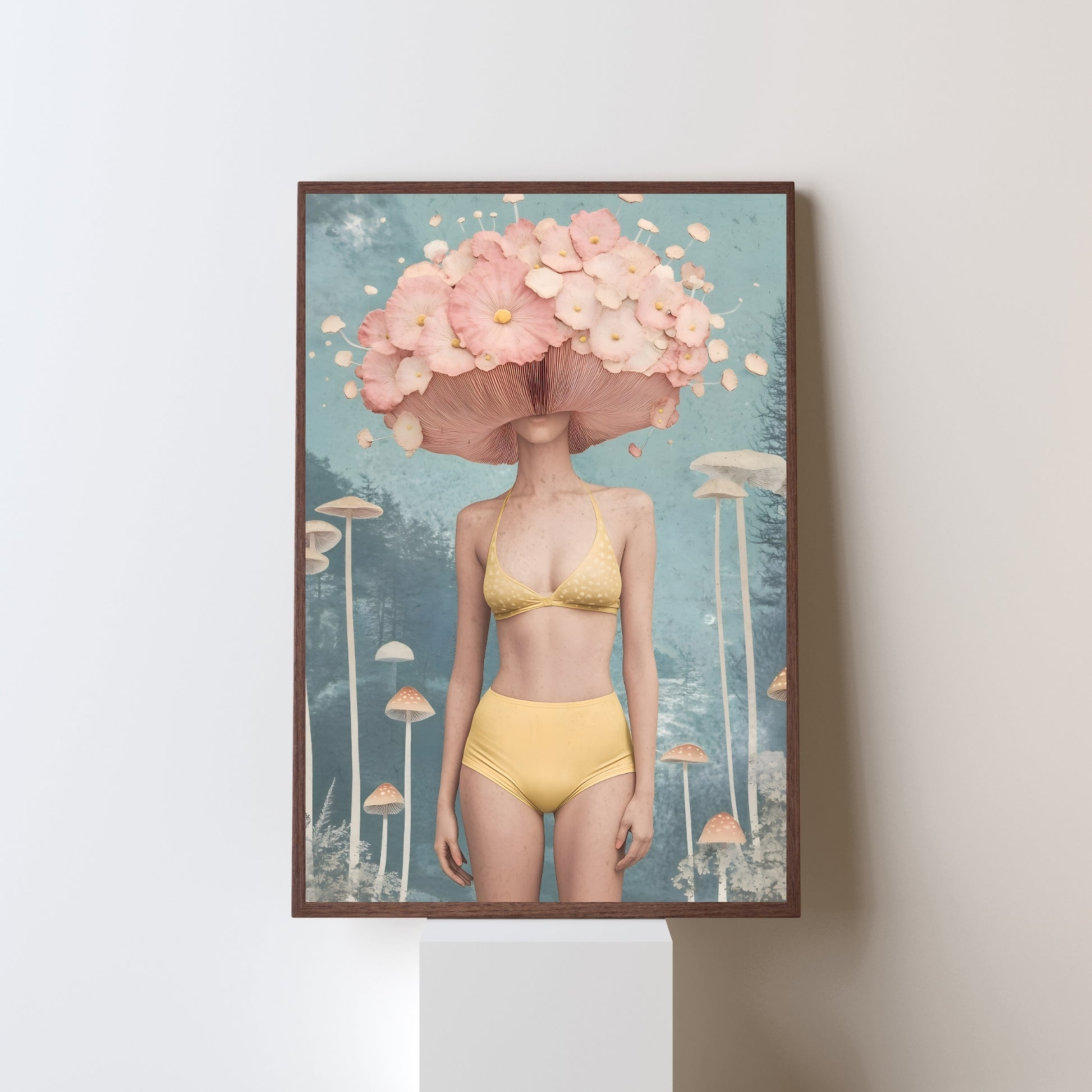 Step into a realm where nature meets imagination. A captivating figure stands among whimsical mushrooms, her delicate form crowned by a vibrant, blooming cap. This surreal artwork invites you to explore the connection between humanity and the otherworldly beauty of nature. A perfect harmony of fantasy and serenity, it whispers tales of hidden realms and the quiet magic that exists in the natural world.