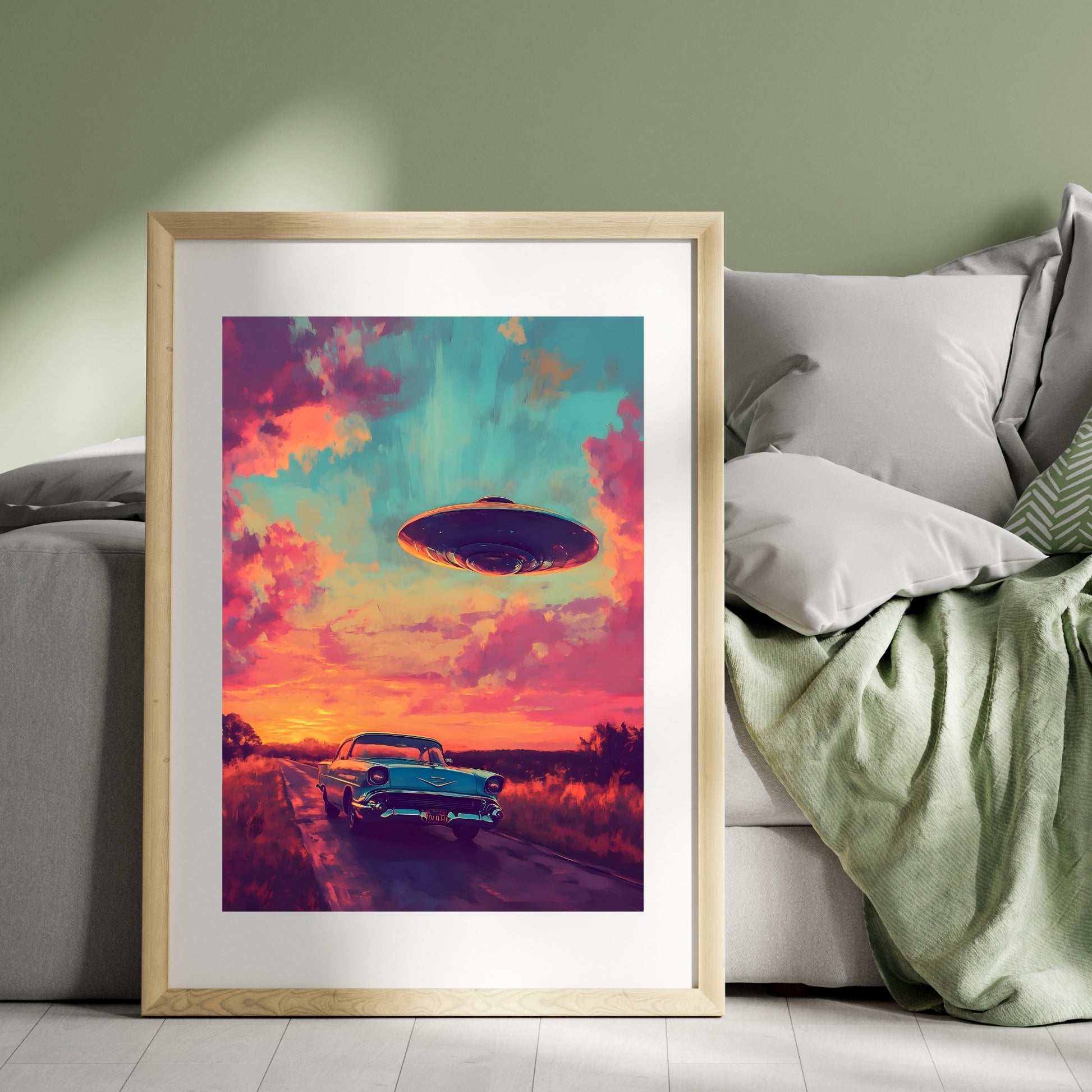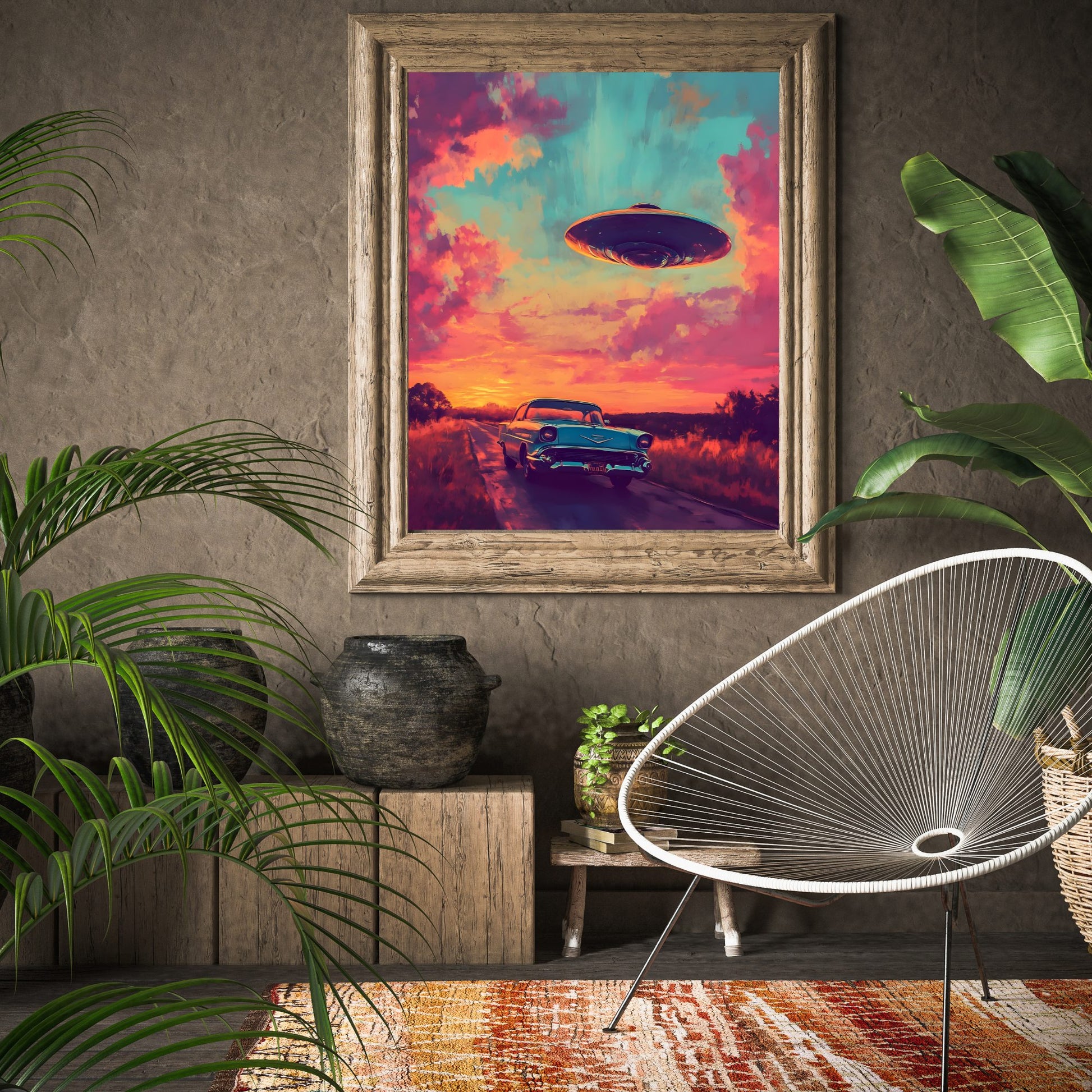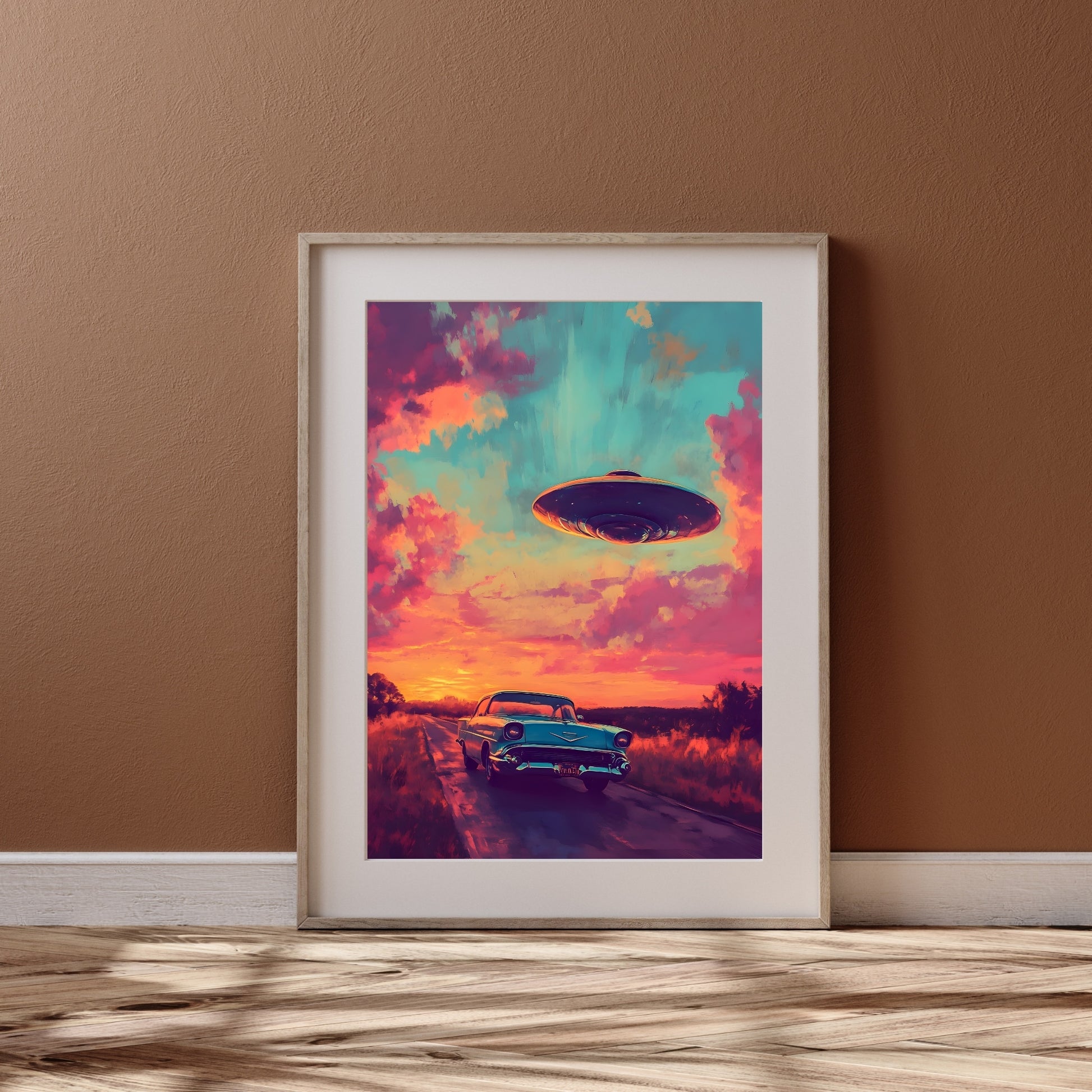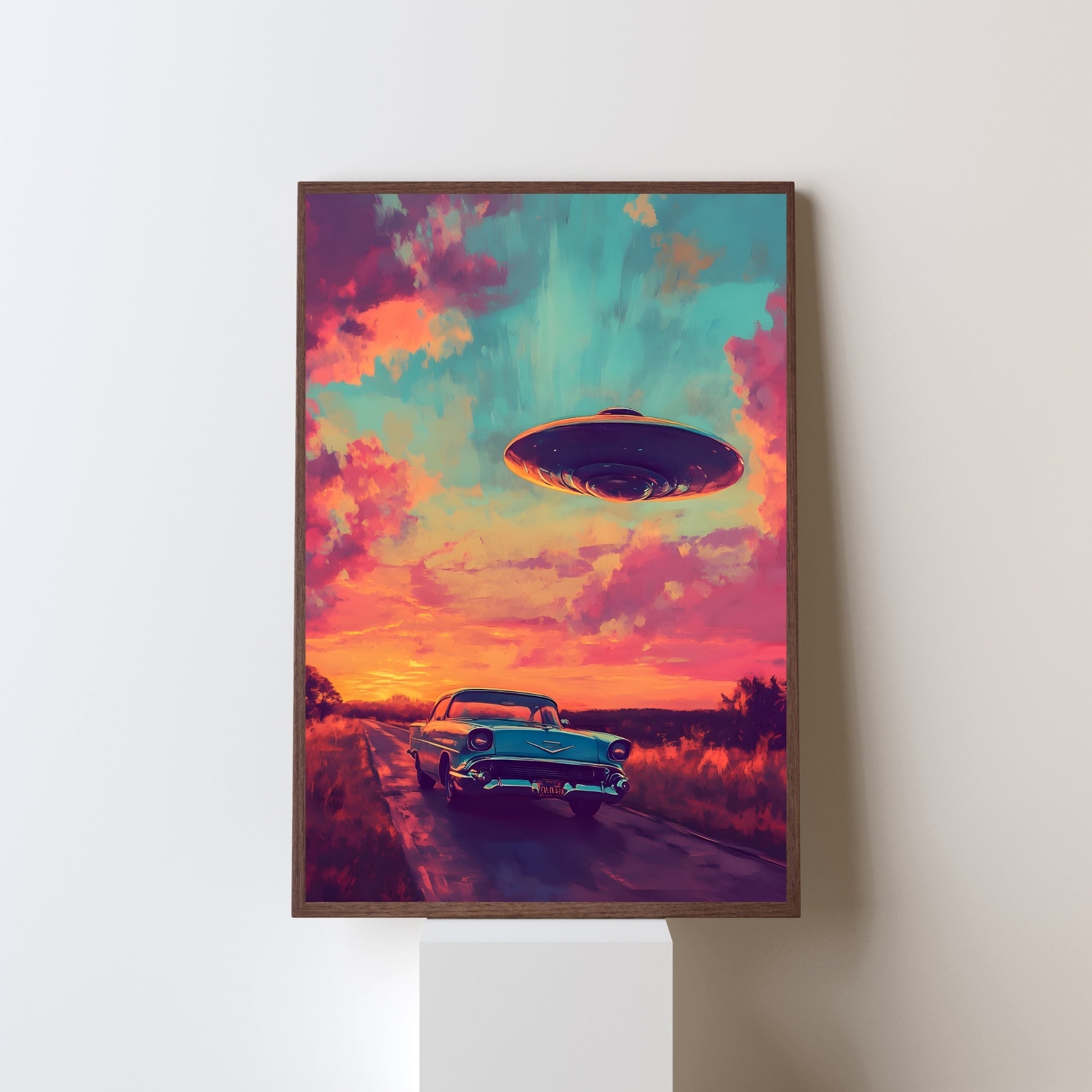 The sunset paints the sky in hues of pink and gold, wrapping the deserted highway in an aura of stillness and anticipation. A classic car stands quietly, as if forgotten or left behind on a journey toward the unknown. The sudden appearance of a UFO on the horizon hints at an encounter that could change everything. This poster captures the spirit of adventure, intertwined with the solitude of the road and the mystery of what lies ahead. Cosmic Encounter is the moment when a journey transforms into a riddle, and the road ahead promises something extraordinary.