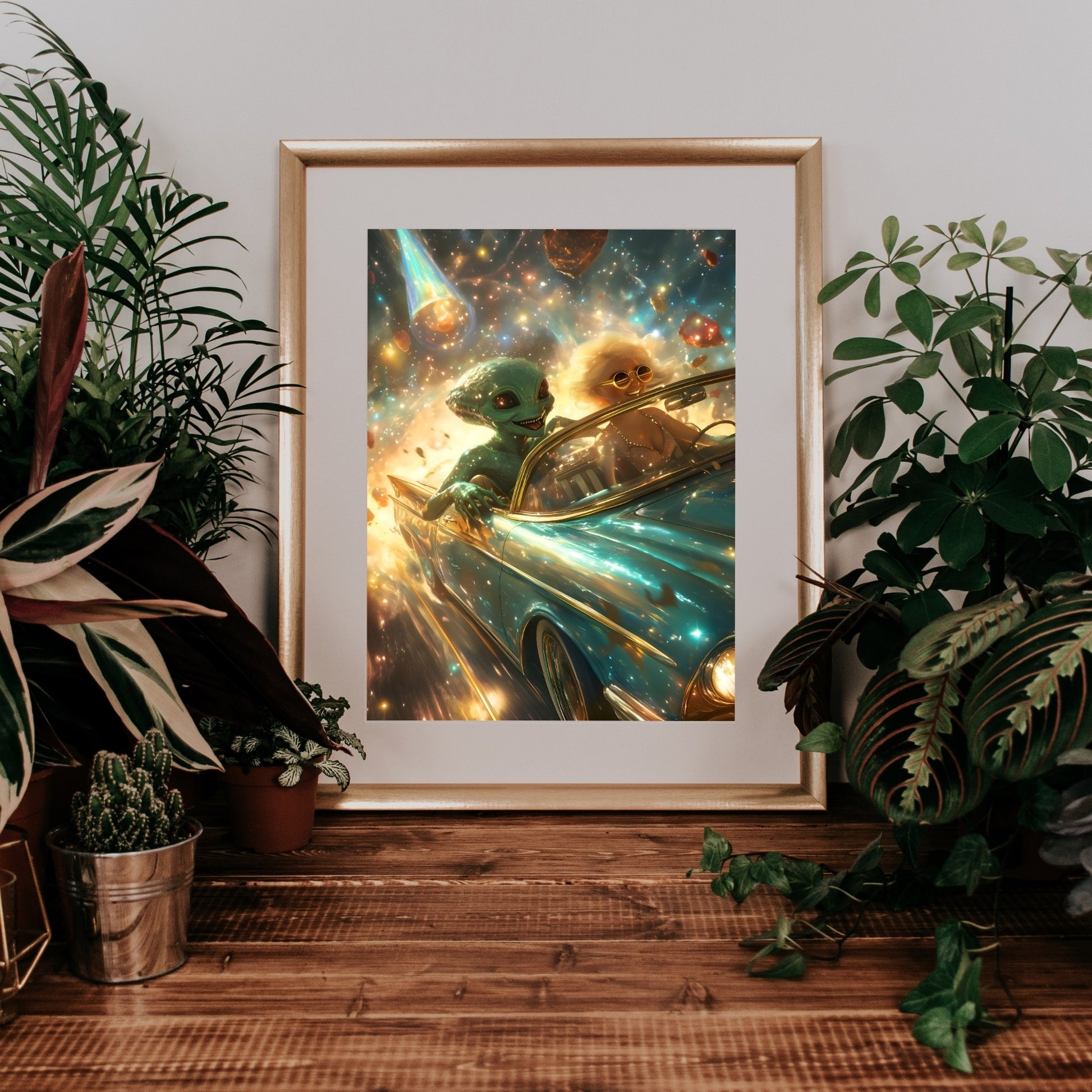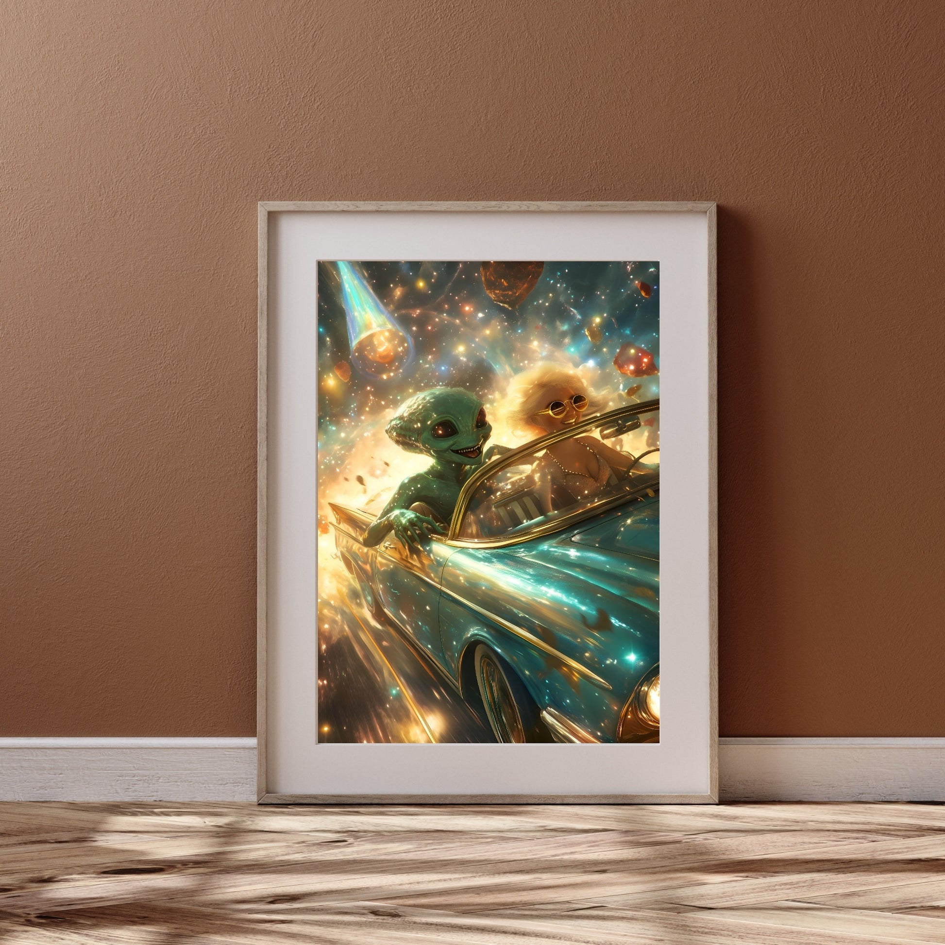 Buckle up for an unforgettable journey through the cosmos. This artwork captures the thrill of intergalactic travel as an alien and a glamorous companion zoom through a galaxy filled with glowing meteors and shimmering stardust. The scene is electrified with speed, adventure, and the pure joy of exploration. Every detail, from the sparkling reflections on the vintage car to the radiant smiles of the passengers, immerses you in a world where the ordinary meets the extraordinary.