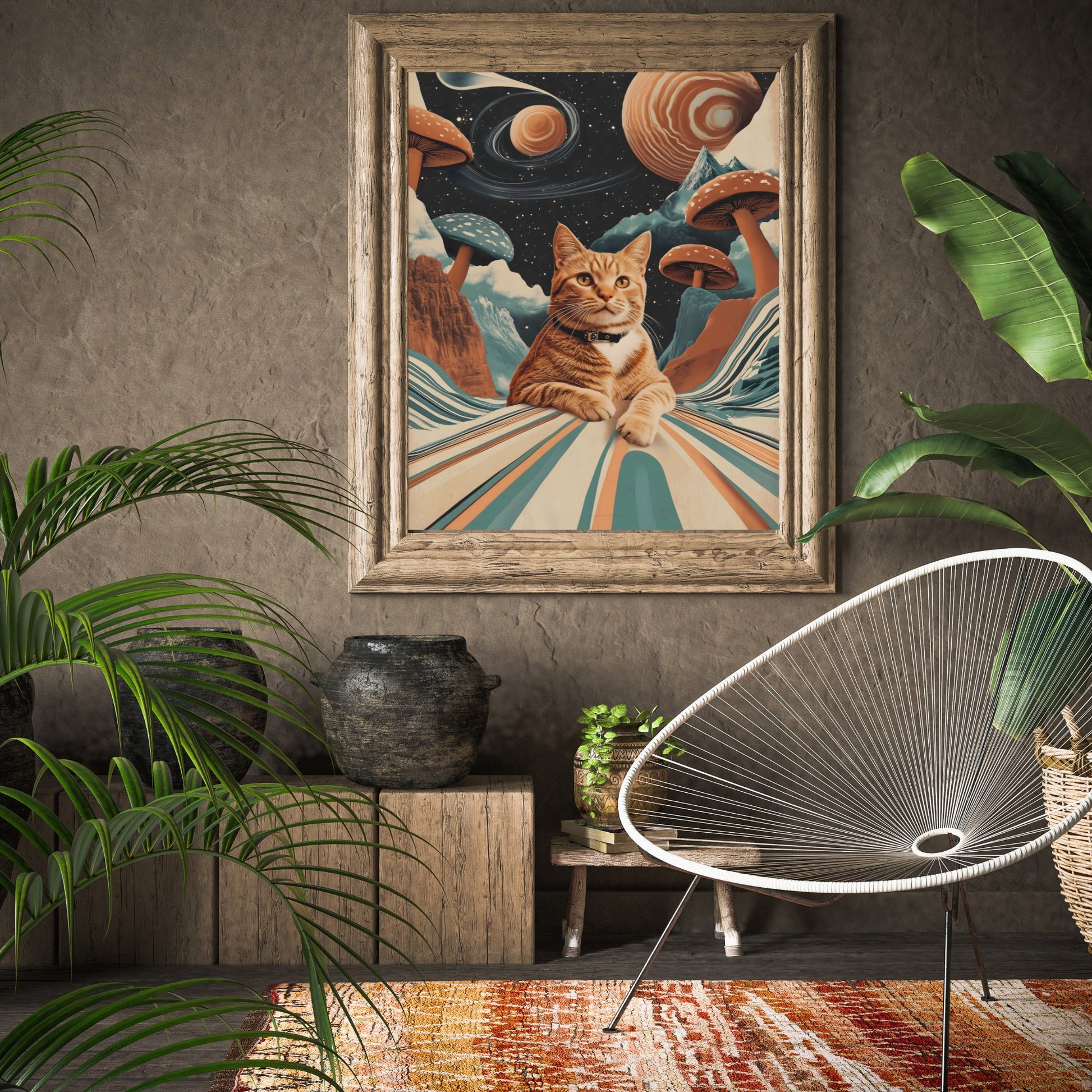 Perched at the edge of time and space, this feline cosmic overlord watches over galaxies, his presence both regal and slightly menacing. He doesn’t chase mice, he rearranges planetary orbits for fun.