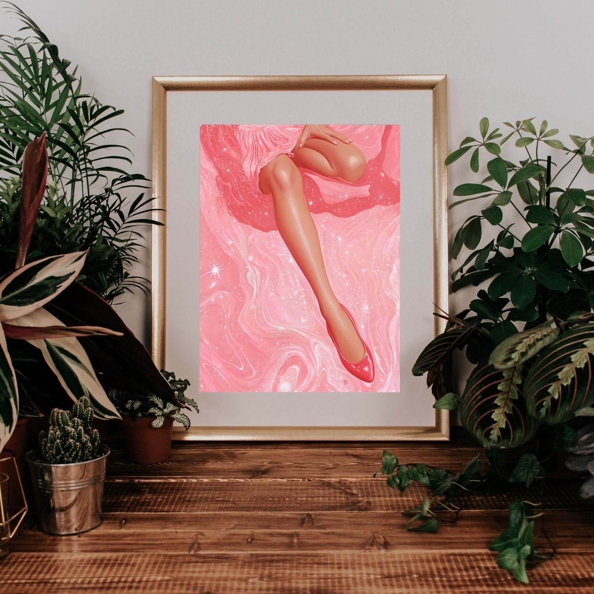 A dreamy fusion of vintage elegance and surreal fantasy, this artwork captures the essence of femininity in a world where reality melts into soft pink hues. A delicate leg in a red heel steps into a swirling cosmos of stardust and liquid dreams, blending classic pin-up charm with a touch of the ethereal. Perfect for lovers of retro aesthetics, feminine beauty, and a hint of magic.