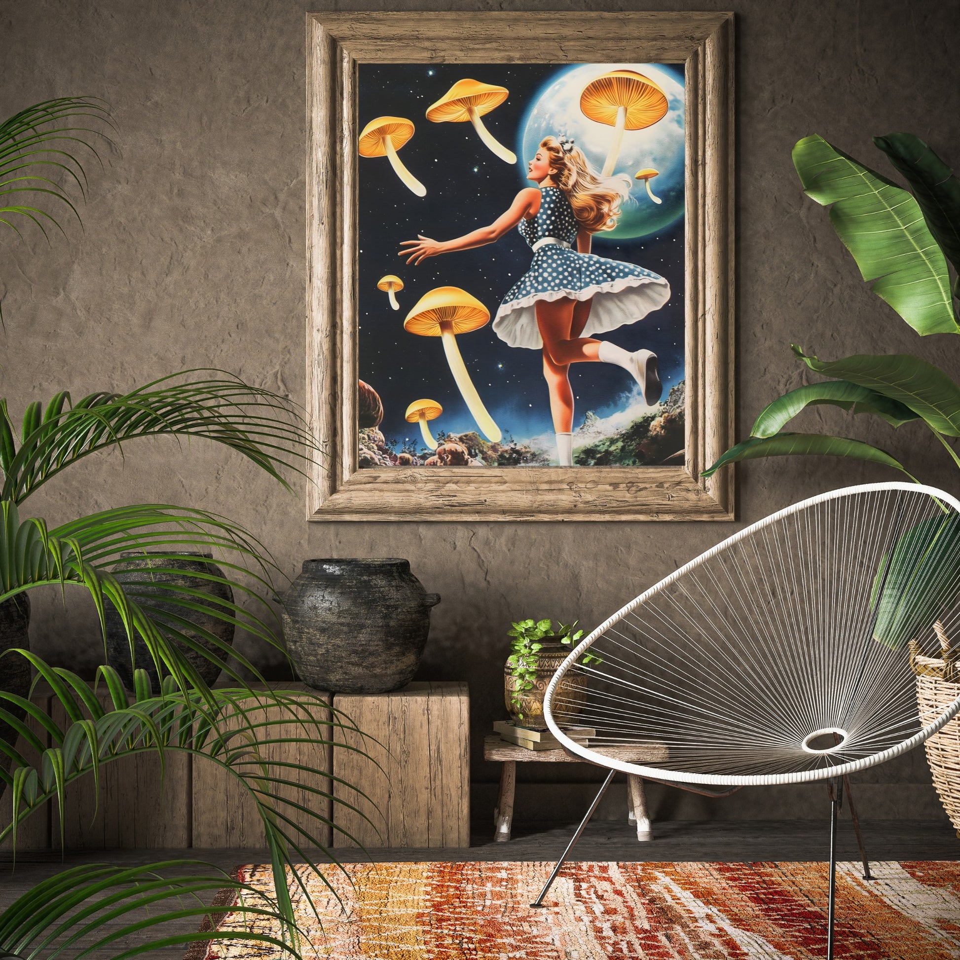 When reality no longer limits your dreams… This poster takes you to a world where gravity has no power, and space is filled with floating mushrooms. A vintage beauty drifts through the stars, bathed in soft moonlight, lost in a dreamlike cosmic escape.
