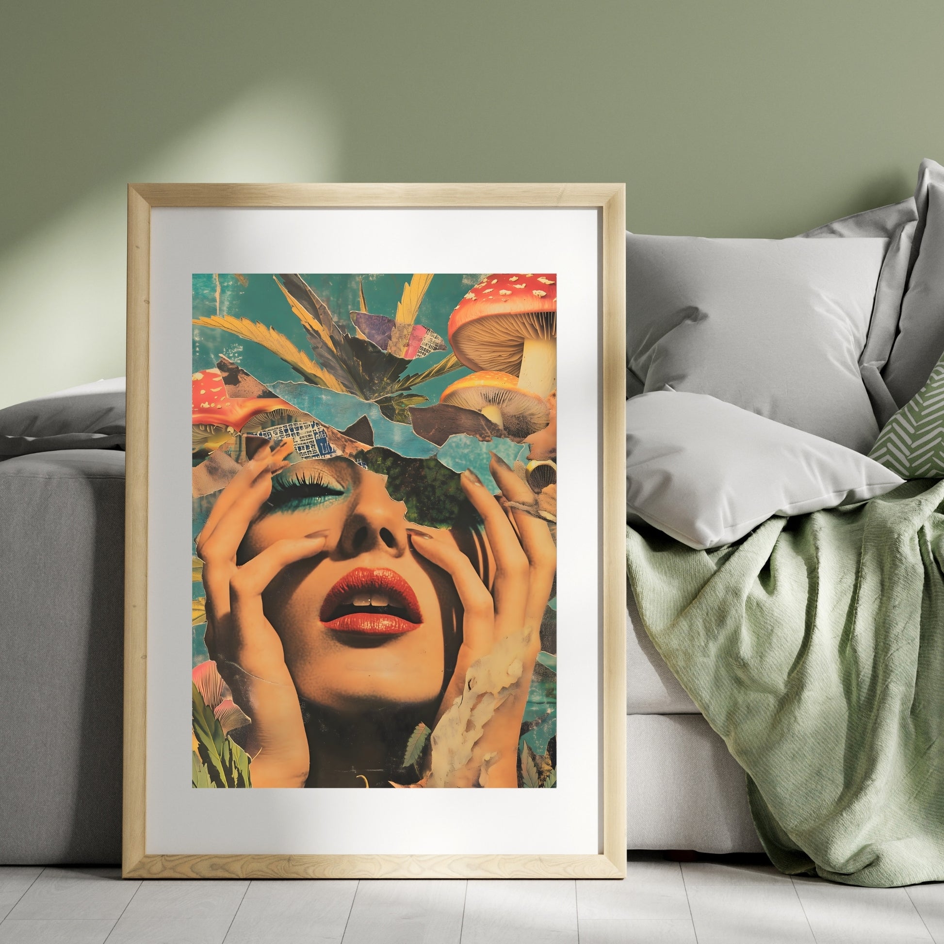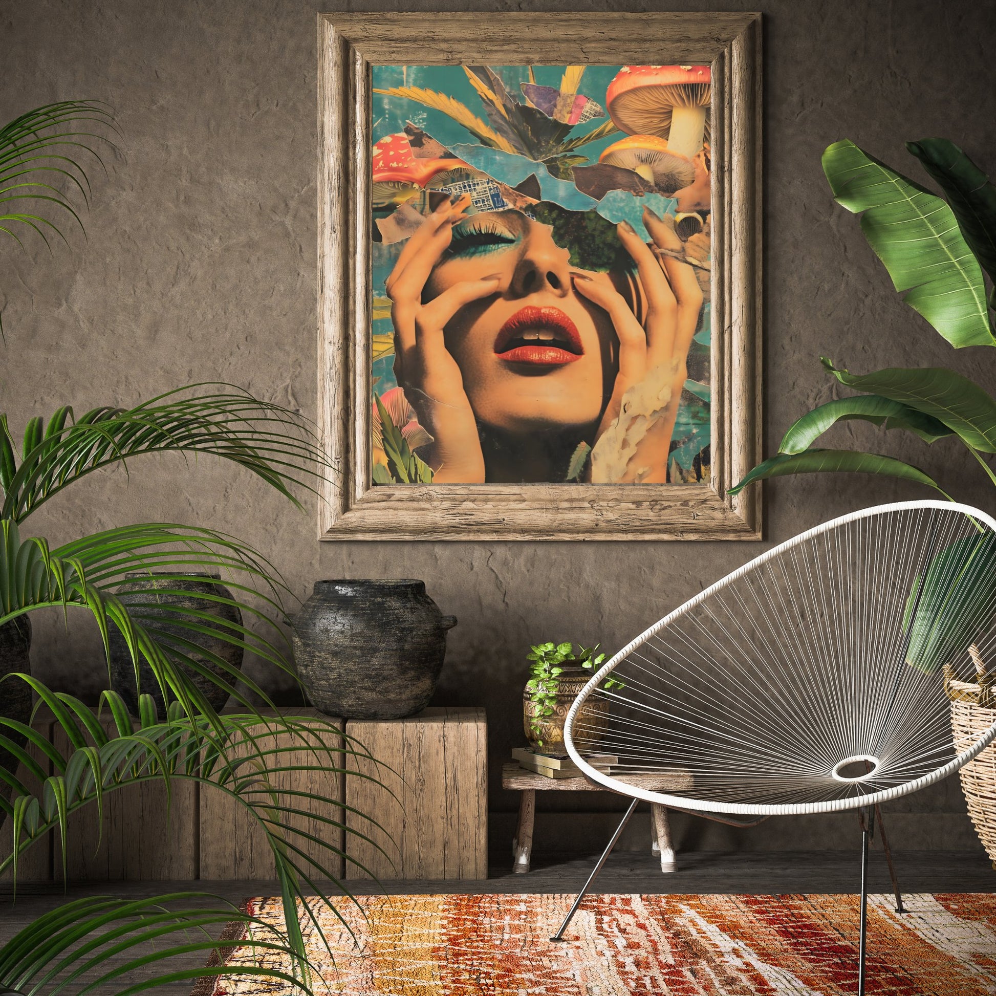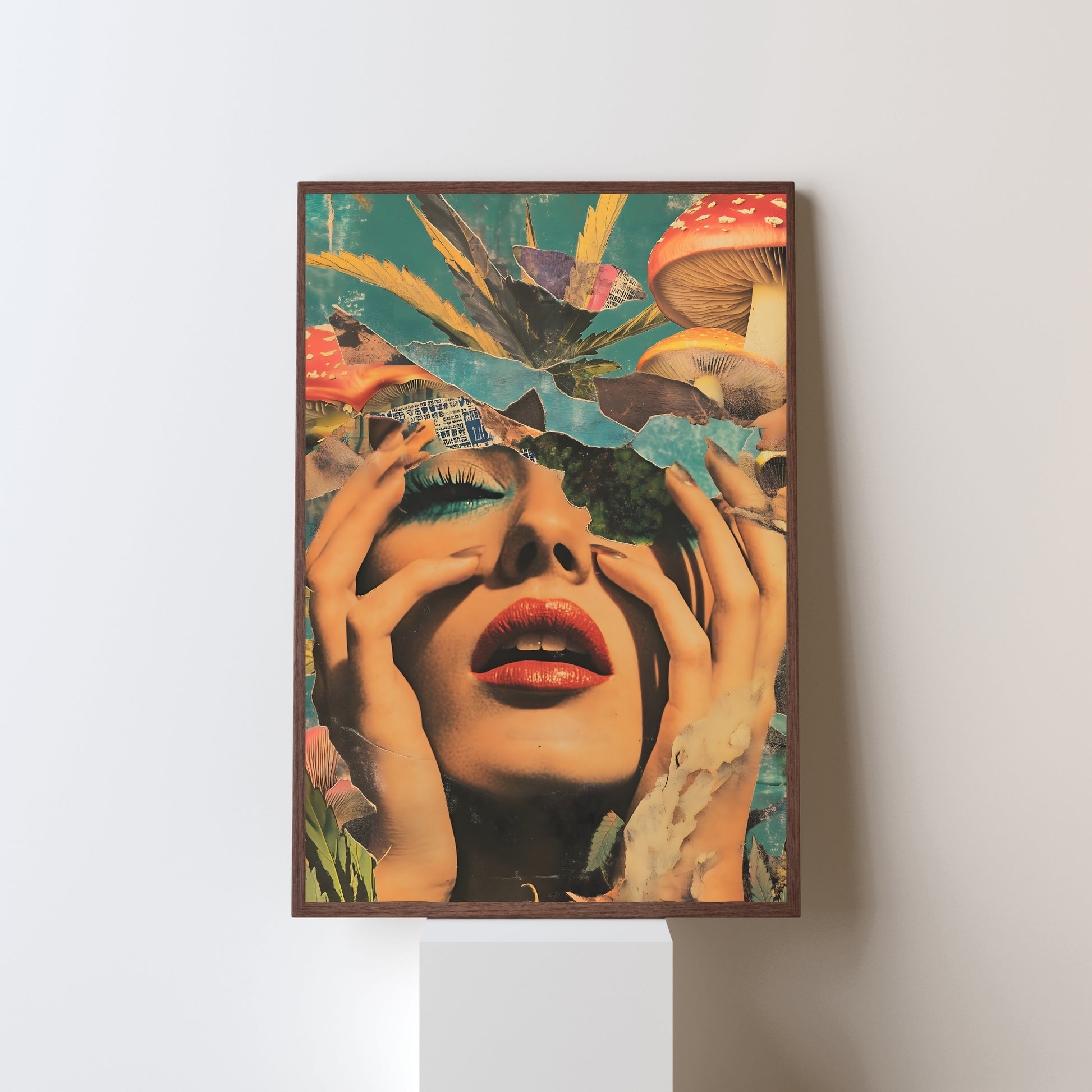 The veil between reality and illusion shatters, peeling away like old paper to reveal something deeper—something raw, untamed, and vividly alive. Her mind blossoms into a kaleidoscope of surreal visions, where mushrooms rise like towers of forgotten dreams, and nature reclaims the cracks of consciousness.