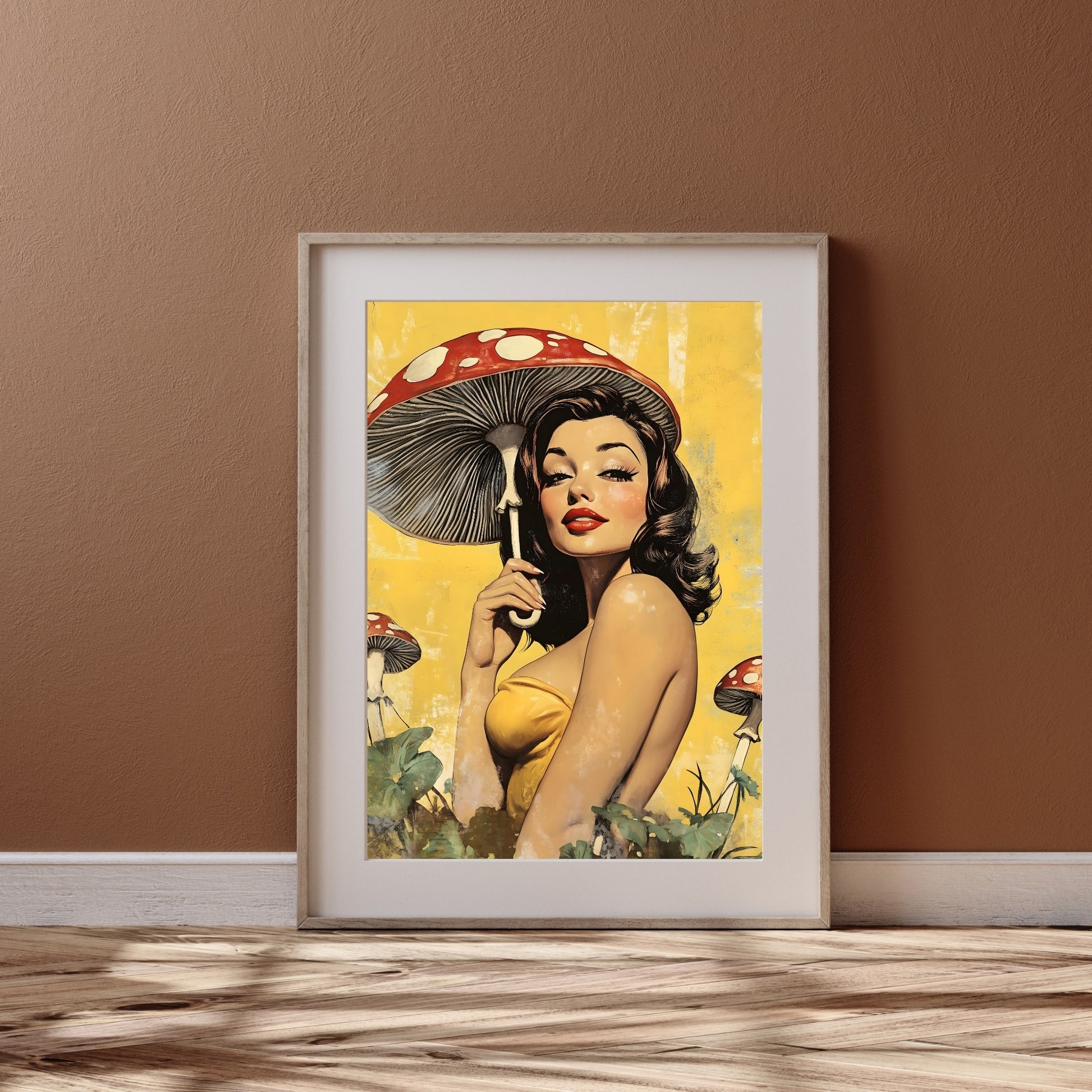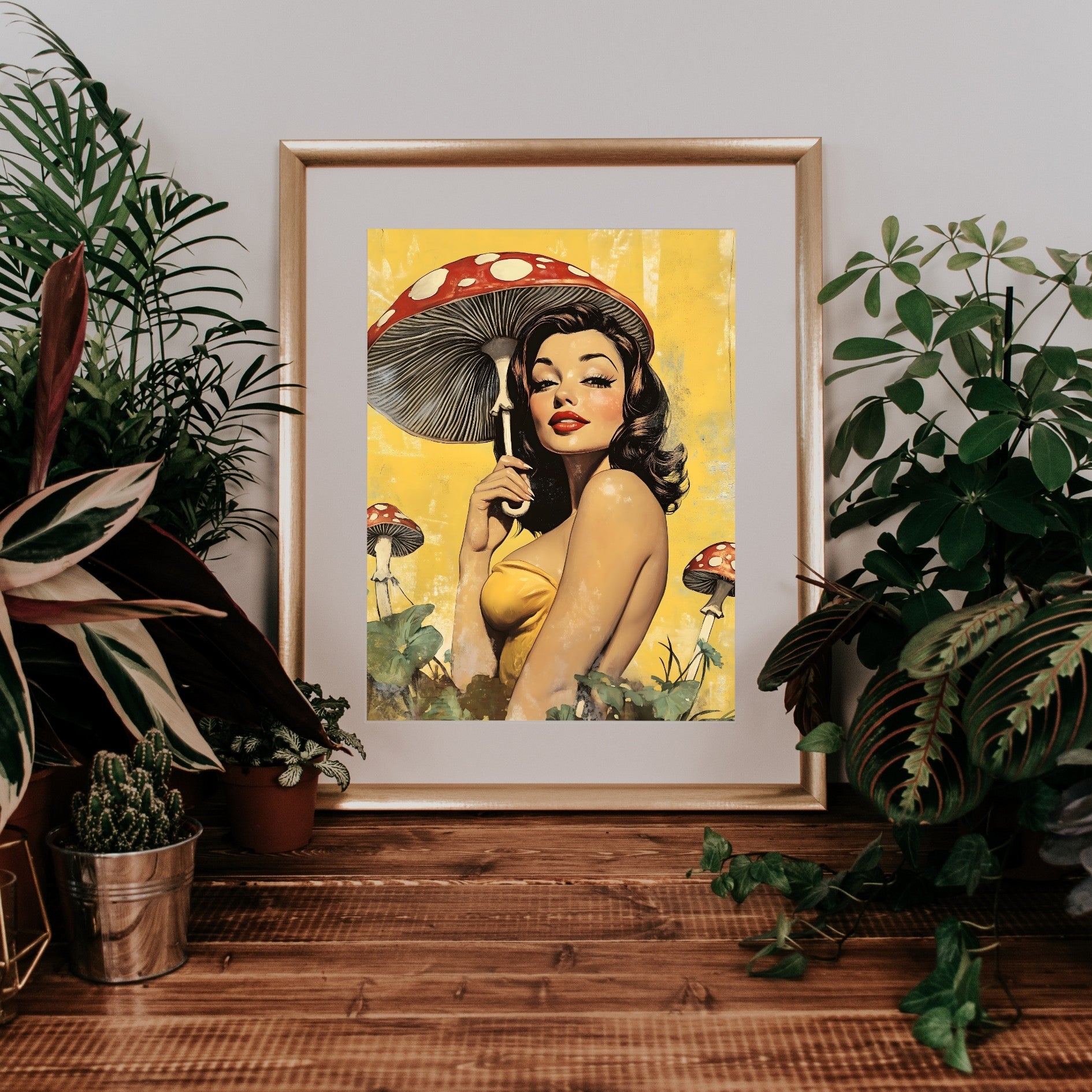 A timeless beauty with a knowing smirk - she holds secrets the world isn’t ready for. Draped in vintage charm and shaded by a toadstool umbrella, she invites you into a world where reality bends, and nature conspires with mystery. Bold, intoxicating, and effortlessly surreal, this artwork blends classic pin-up glamour with a touch of psychedelic wonder.