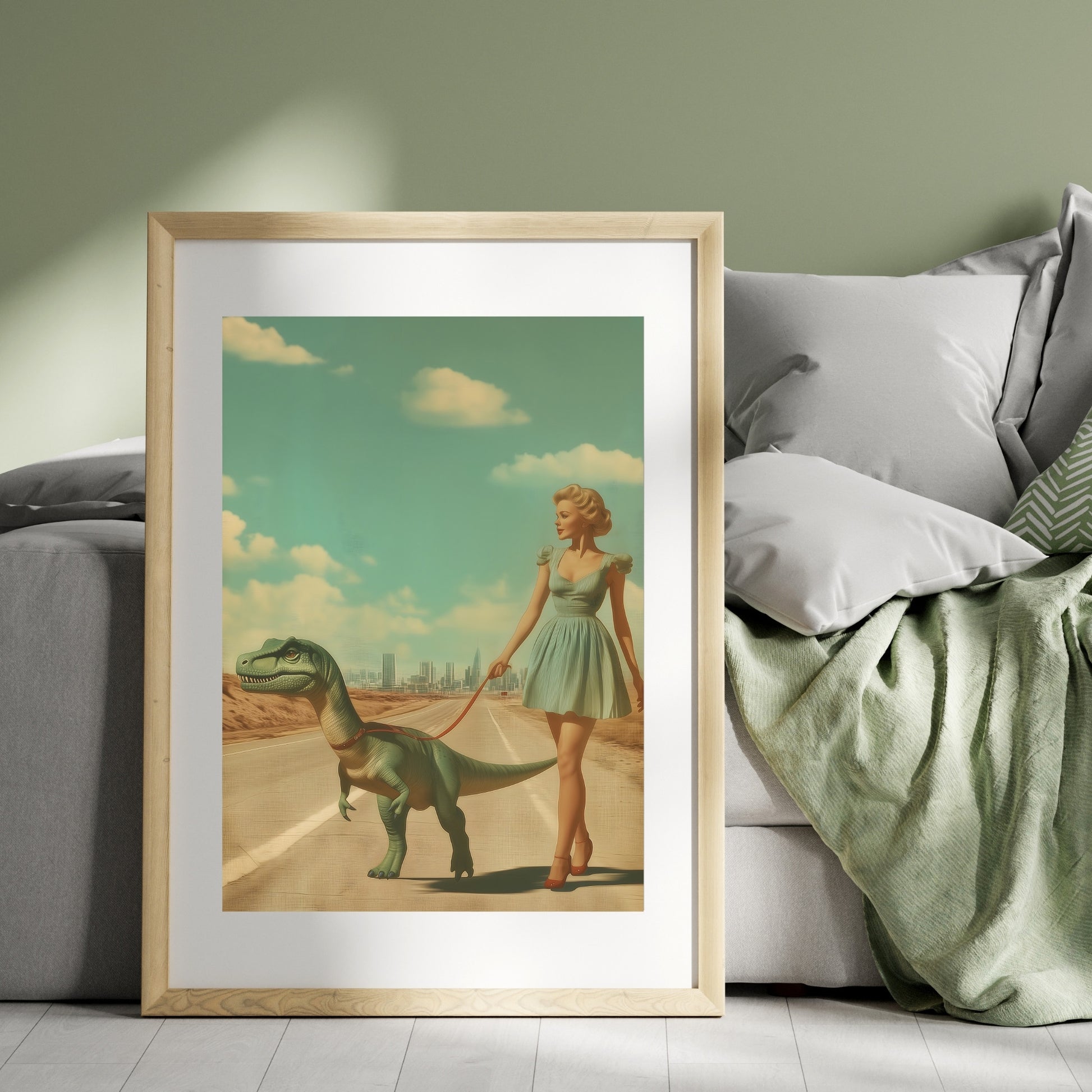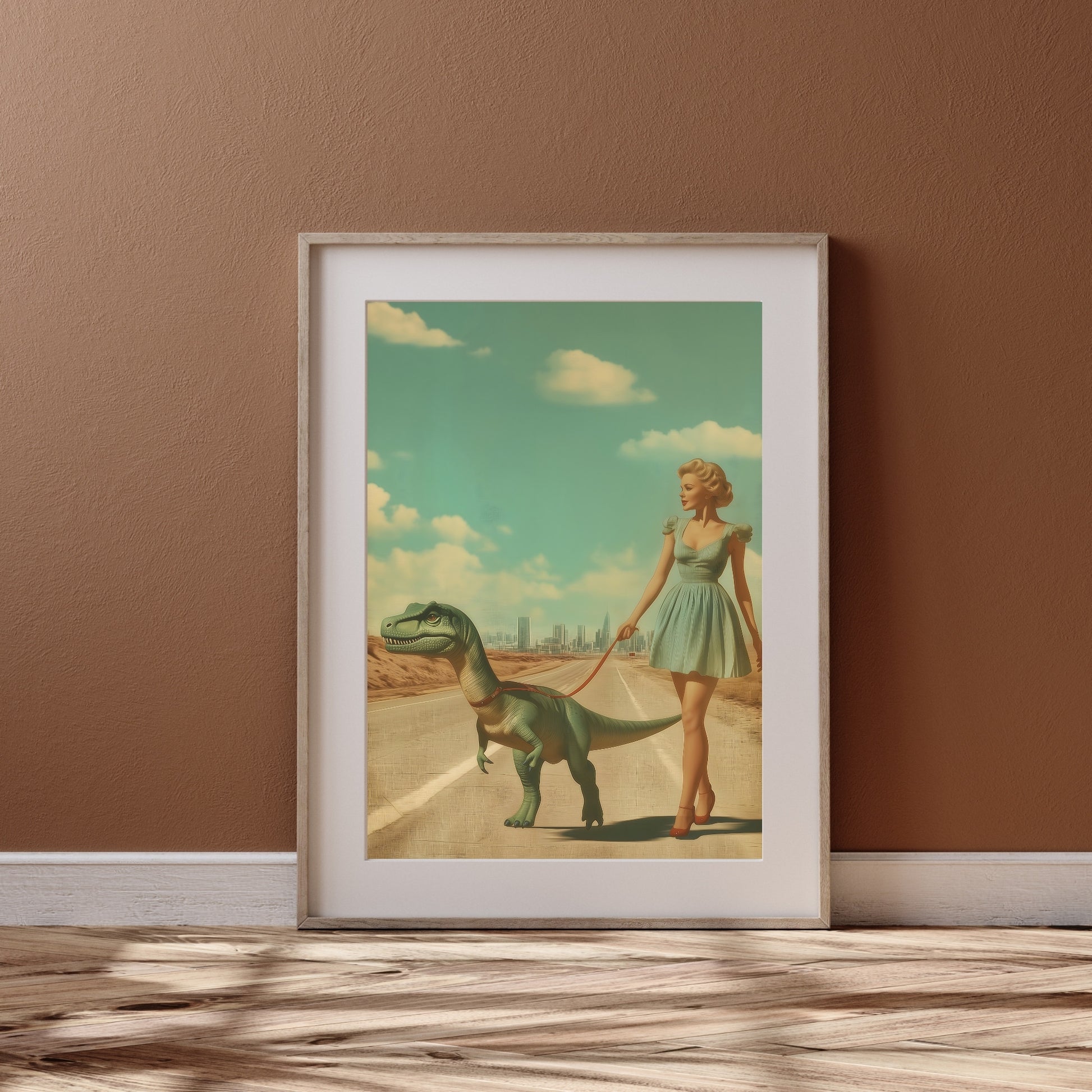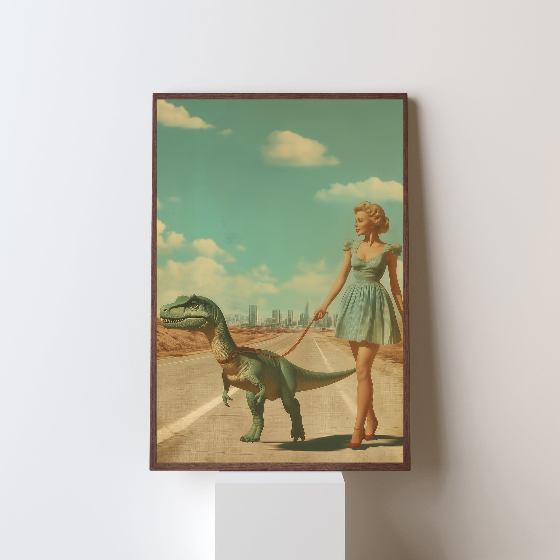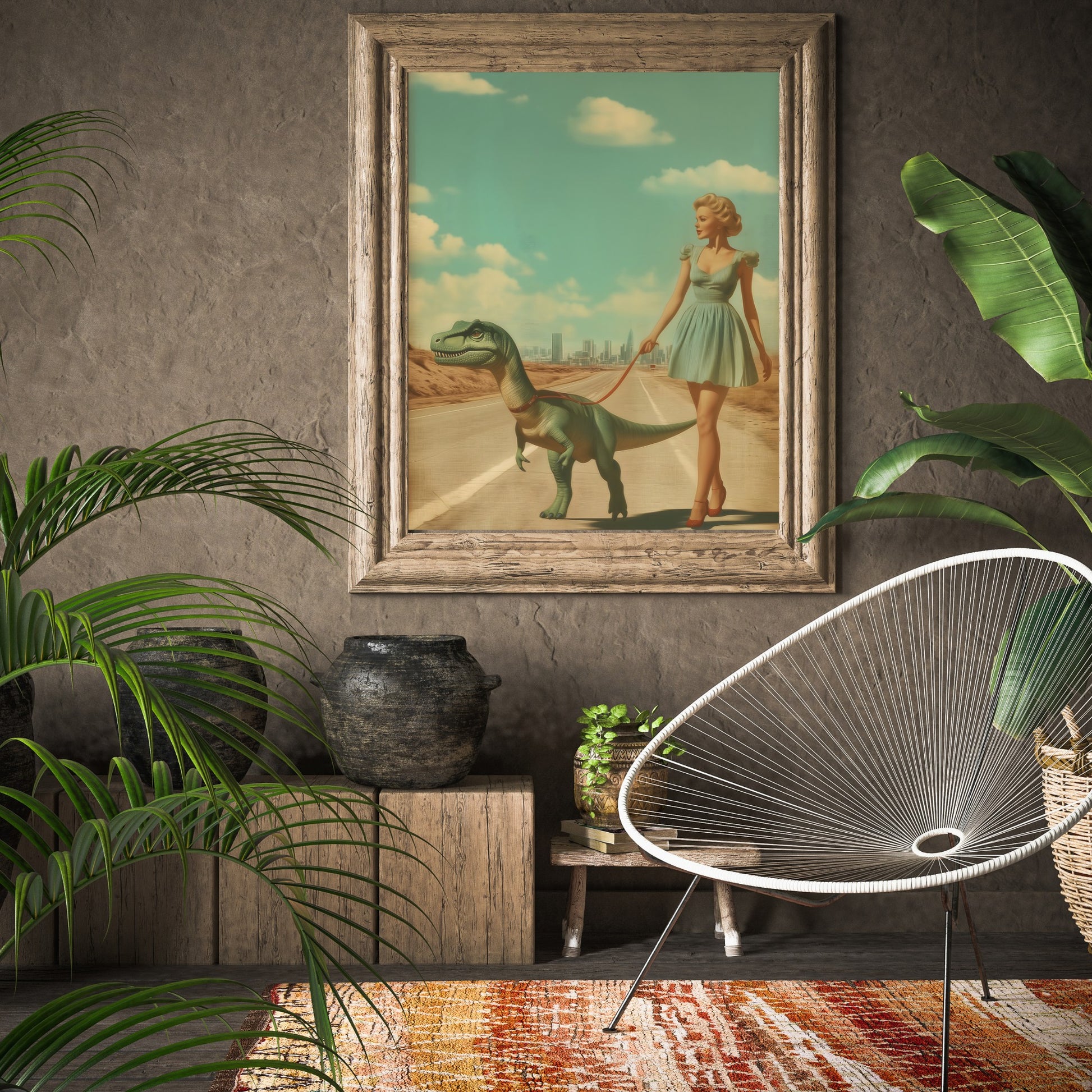 A surreal blend of vintage charm and prehistoric adventure, this artwork is perfect for those who love a touch of whimsy with their nostalgia. Add it to your space and let your imagination run wild!