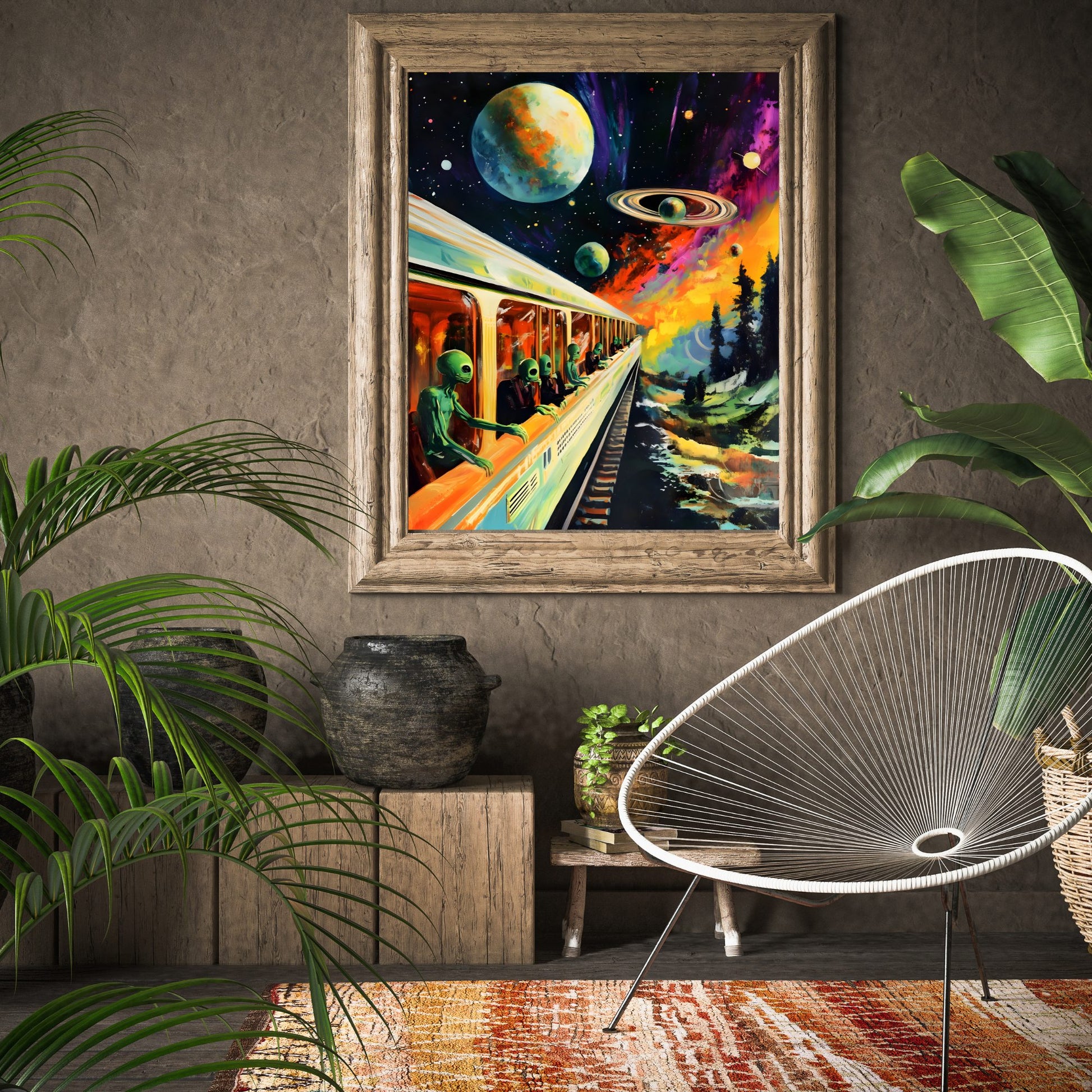 A majestic train races through the boundless cosmos, carrying its extraordinary passengers toward mysterious worlds. Against a backdrop of magnificent planets and shimmering stars, this moment feels suspended between reality and fantasy. Alien travelers gaze thoughtfully into the infinite expanse, reminding us that the thirst for discovery is a universal language. This poster is a symbol that no matter where we come from, we all seek a path to new horizons, where dreams merge with infinity.