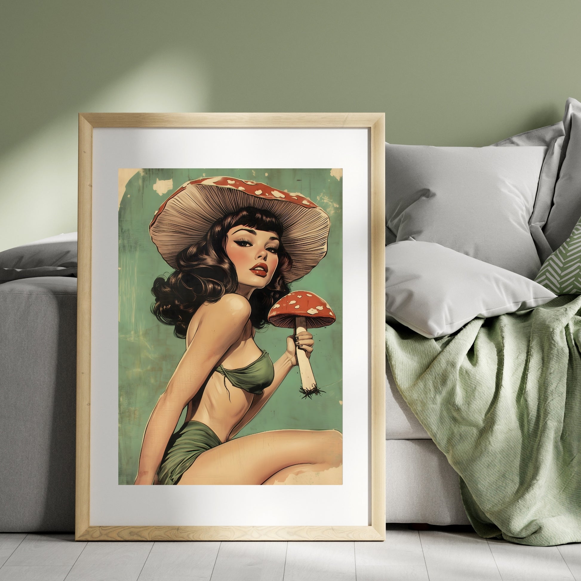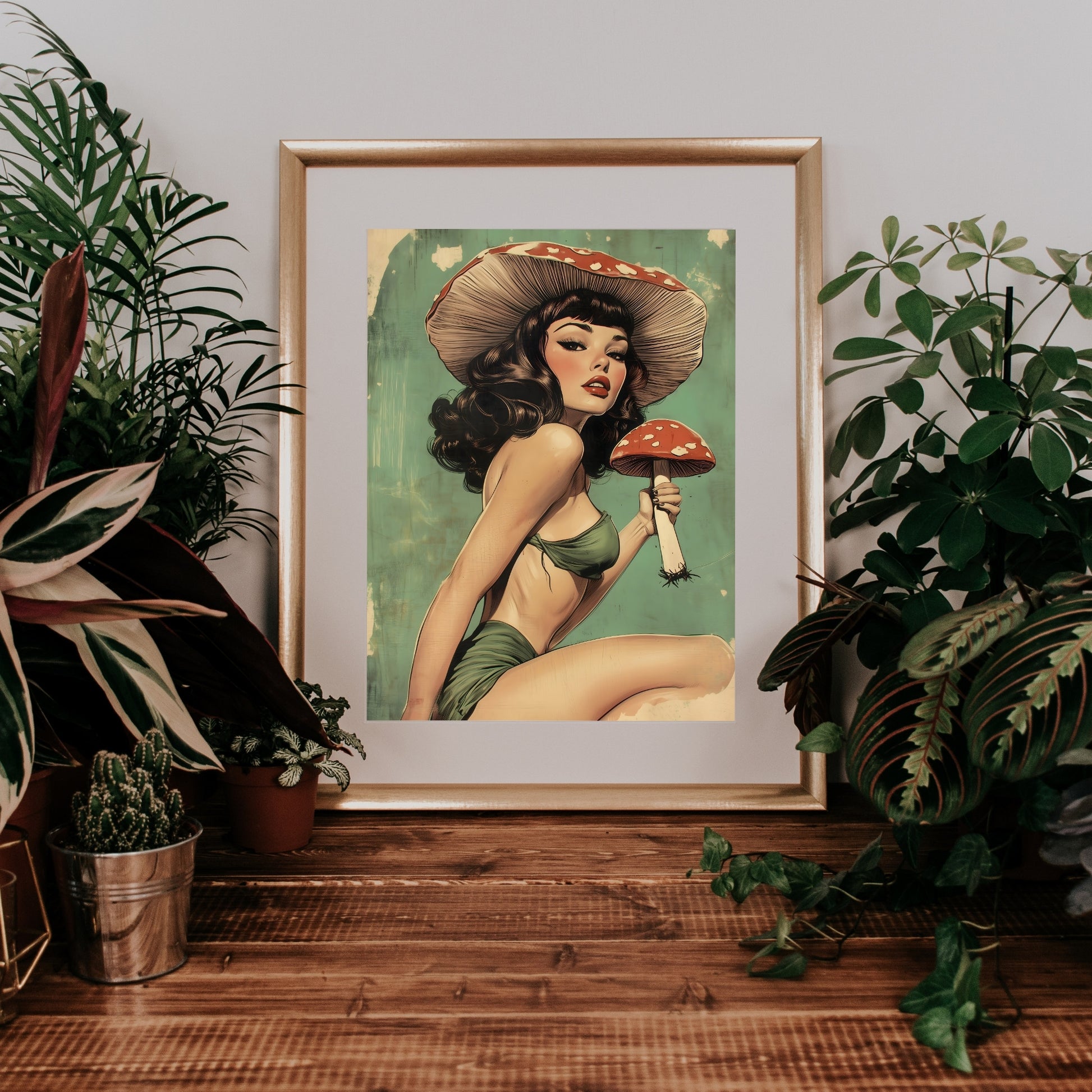 Her gaze is daring, her presence enigmatic. Suspended between nature and dreams, between reality and fantasy, she exists beyond the rules. There’s a mystique in her connection to nature, an allure that feels almost magical. This vintage-inspired poster is a bold statement piece, drawing attention and sparking admiration.