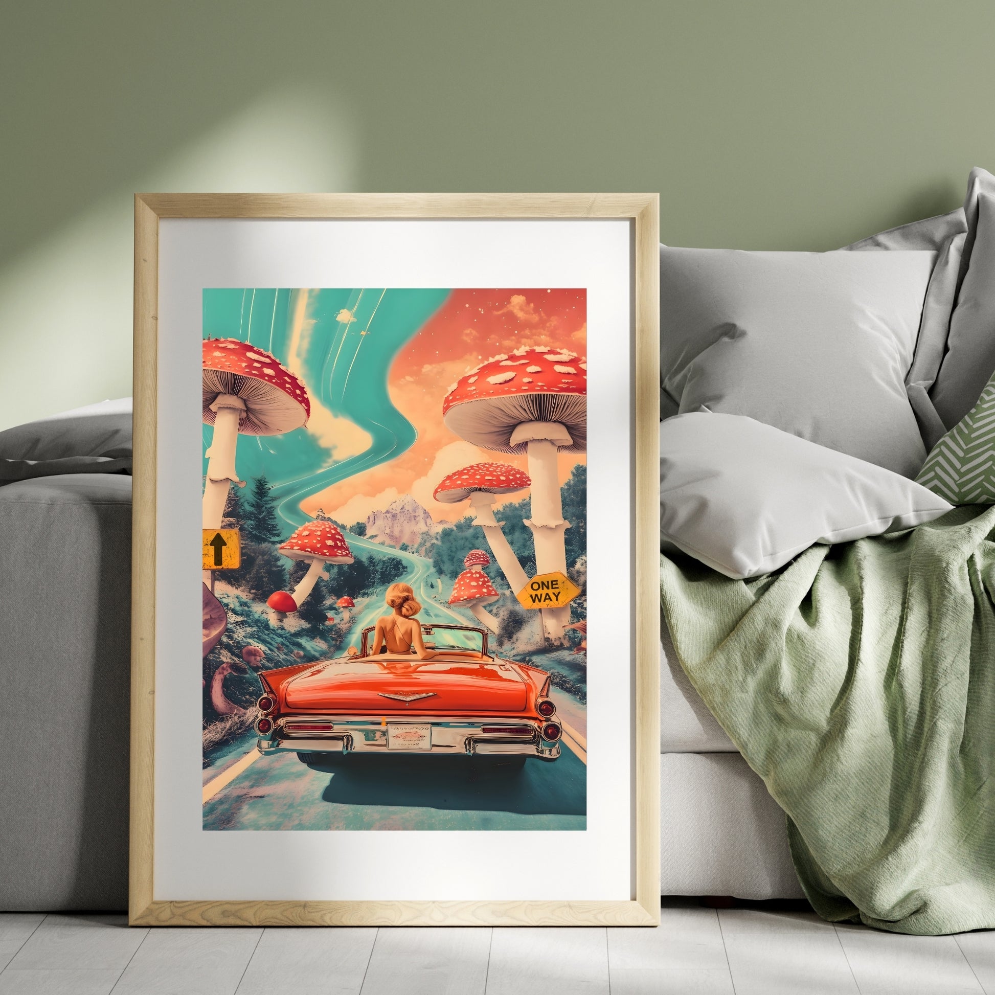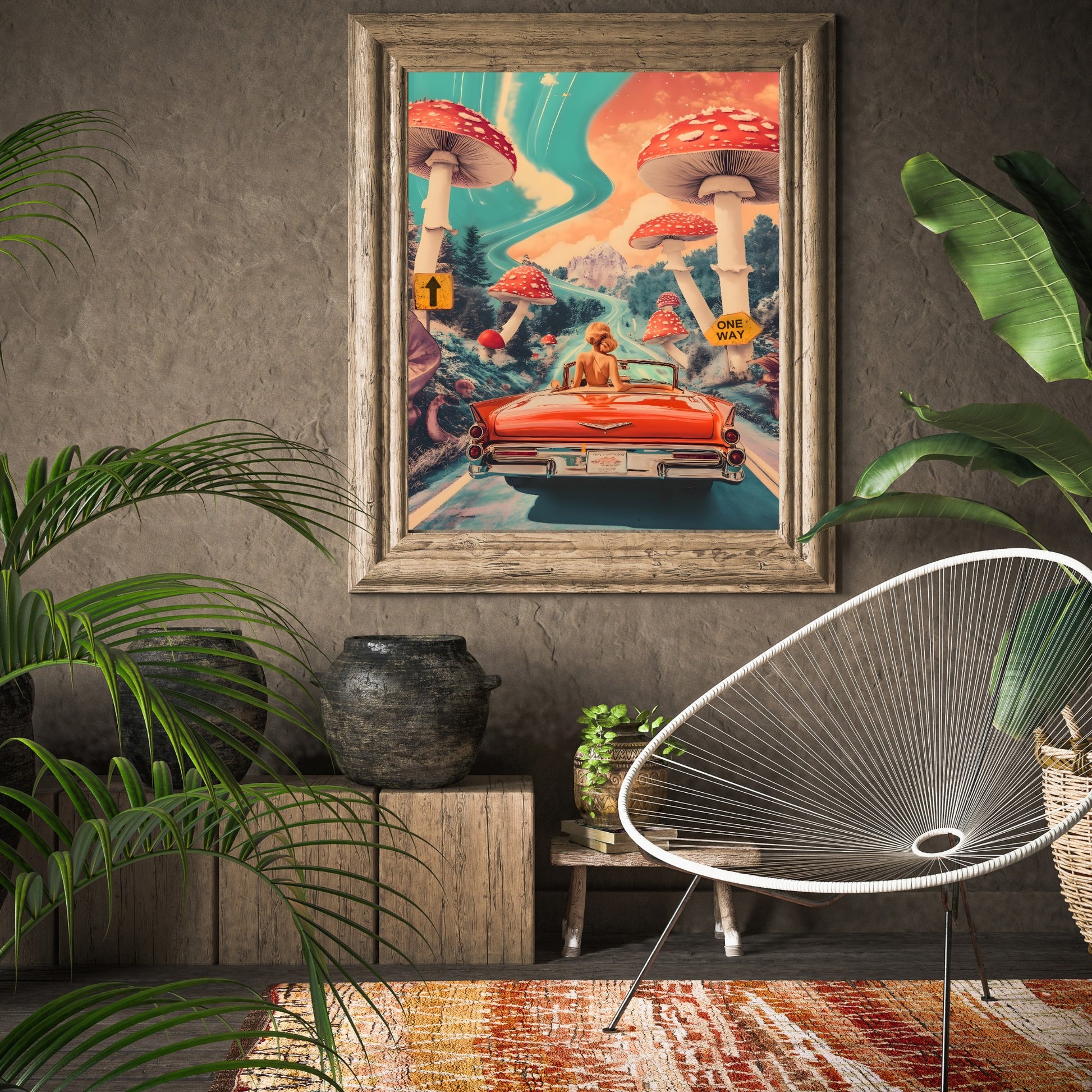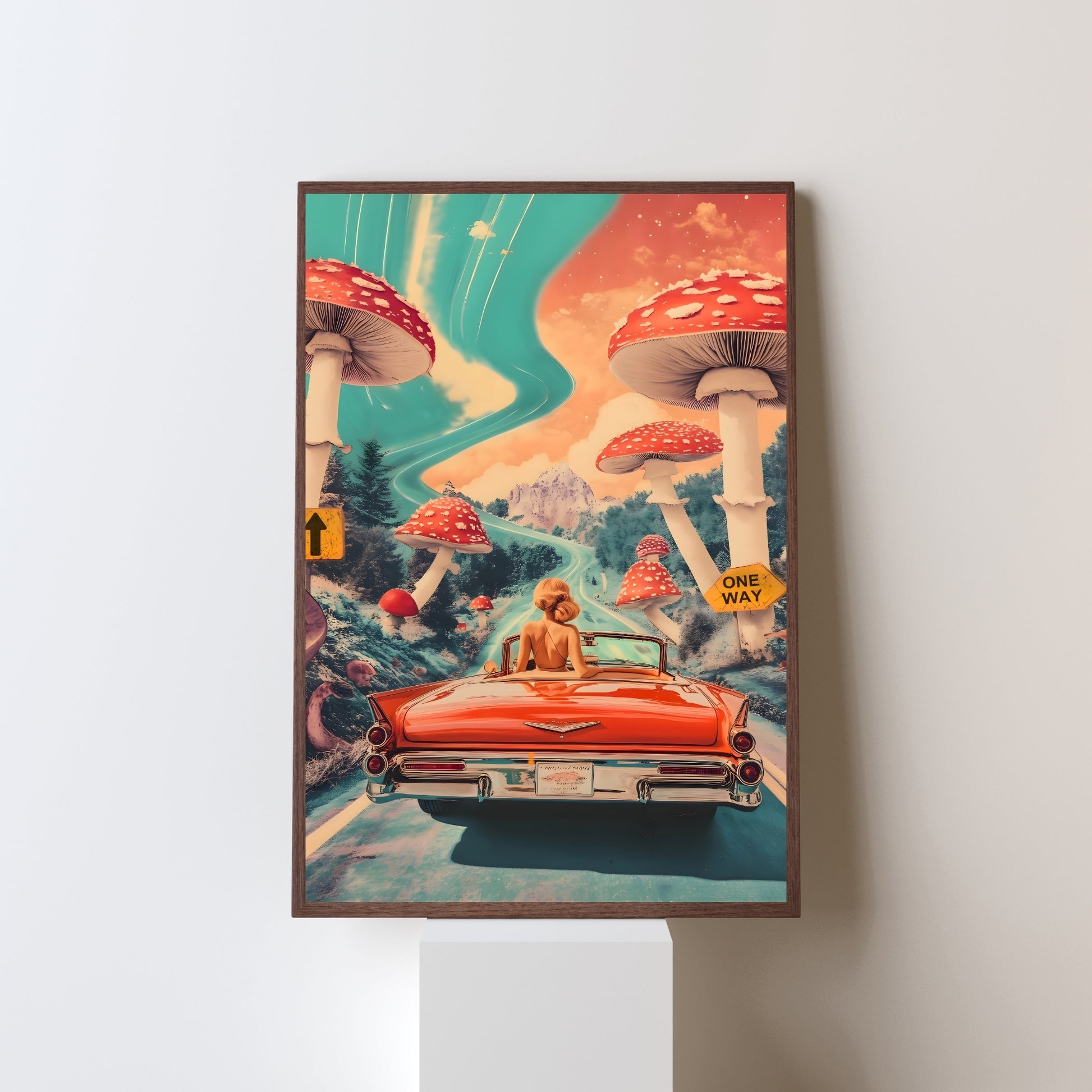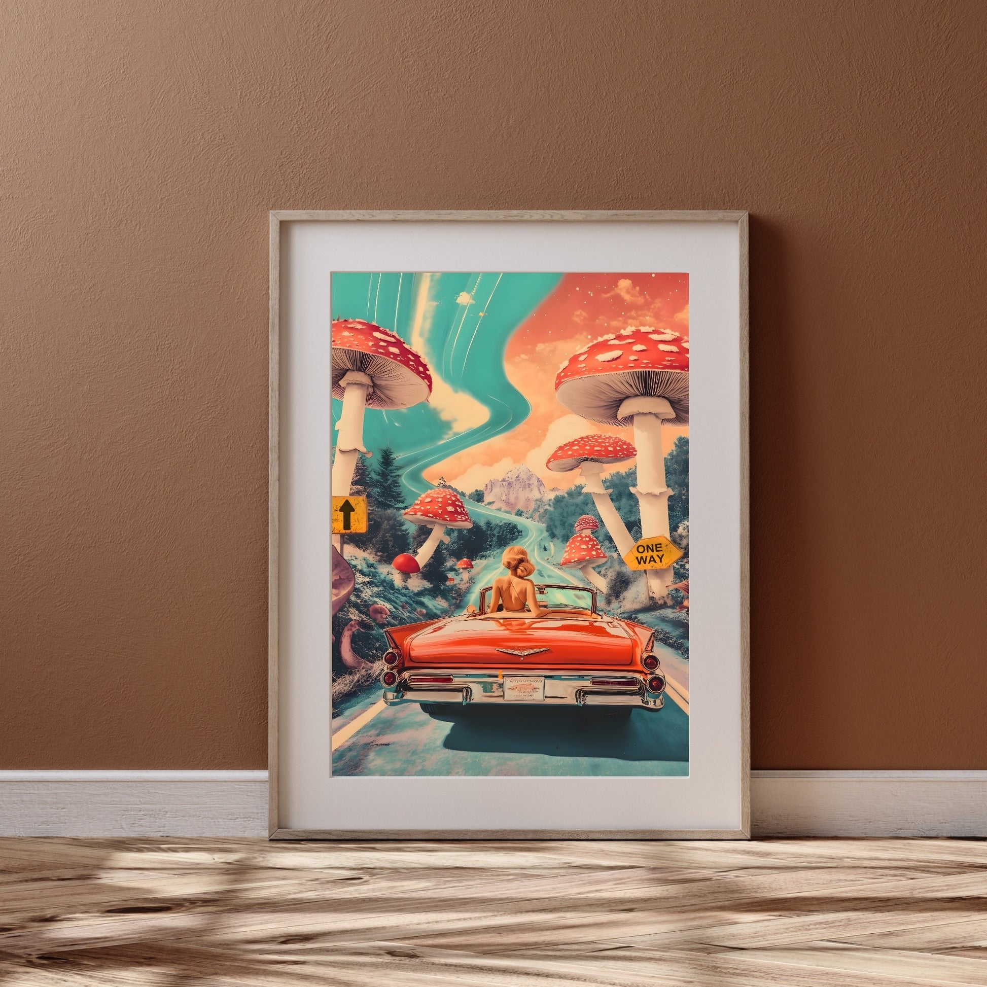 Buckle up, we’re heading straight into the surreal! A dreamy road trip where the skies swirl, giant mushrooms tower like ancient guardians, and there’s only one way forward — into the unknown. Perfect for those who crave adventure, nostalgia, and a touch of the extraordinary. Let this artwork remind you that the best journeys are the ones you take with an open heart and a wild spirit.