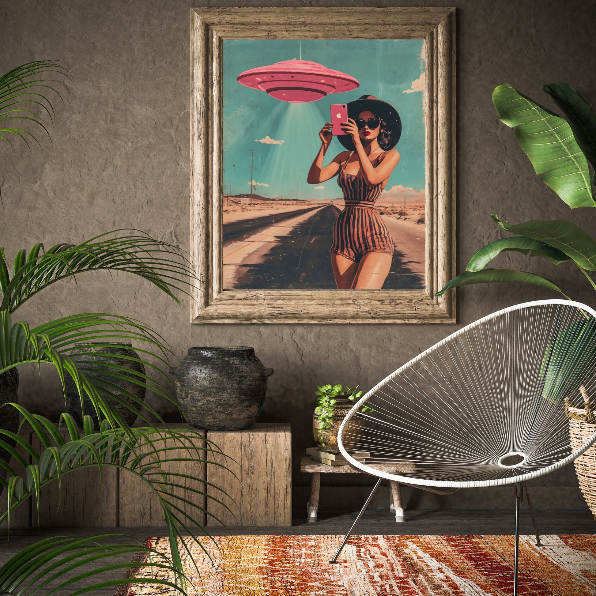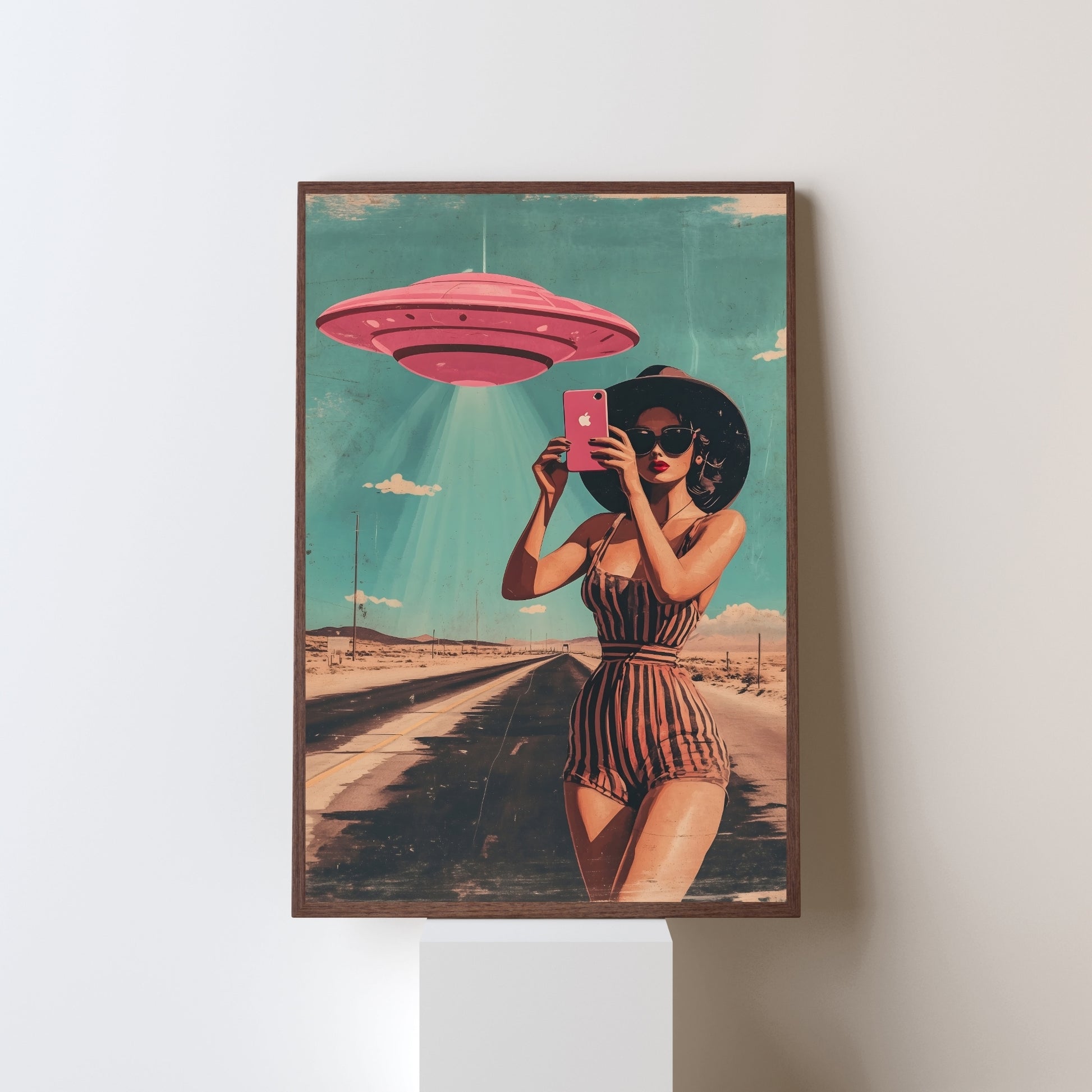A surreal fusion of retro futurism and modern obsession, this piece playfully nods to our era of instant validation. Perfect for those who appreciate a twist of irony, vintage aesthetics, and a reality that’s always up for debate.