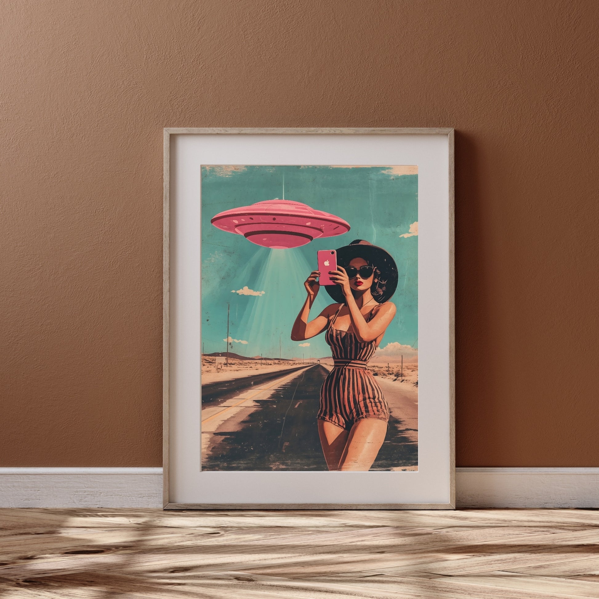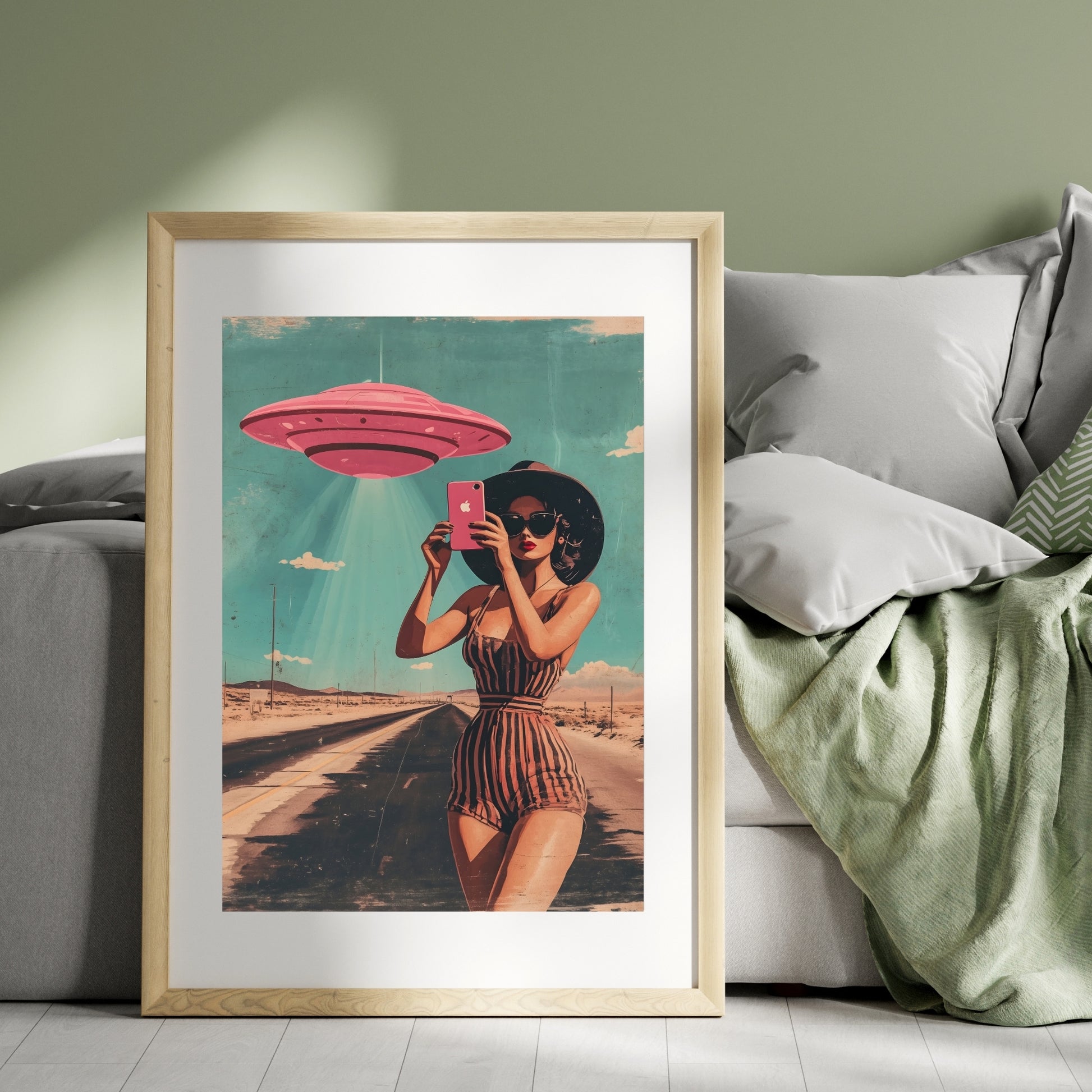 She stands poised in the desert, sunglasses shielding her from both the sun and the absurdity of the situation. A pink UFO looms above, its beam casting an eerie glow - but no fear, only perfect lighting.