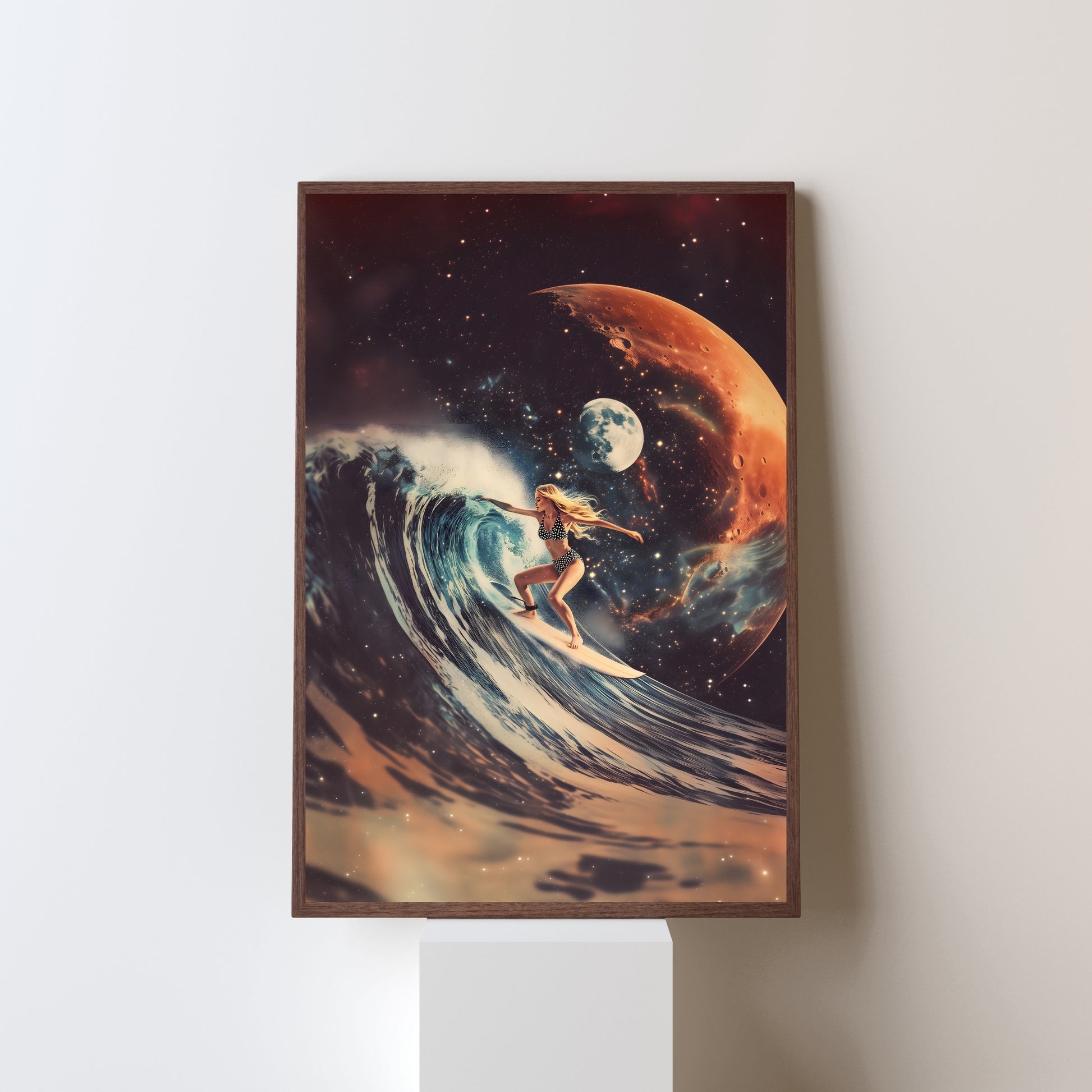 Sure, surfing at the beach is cool, but ever tried riding waves across the galaxy? Our fearless retro beauty decided Earth’s oceans just weren’t enough, so she’s catching cosmic waves between planets instead. Because if you’re going to chase thrills, might as well go interstellar.