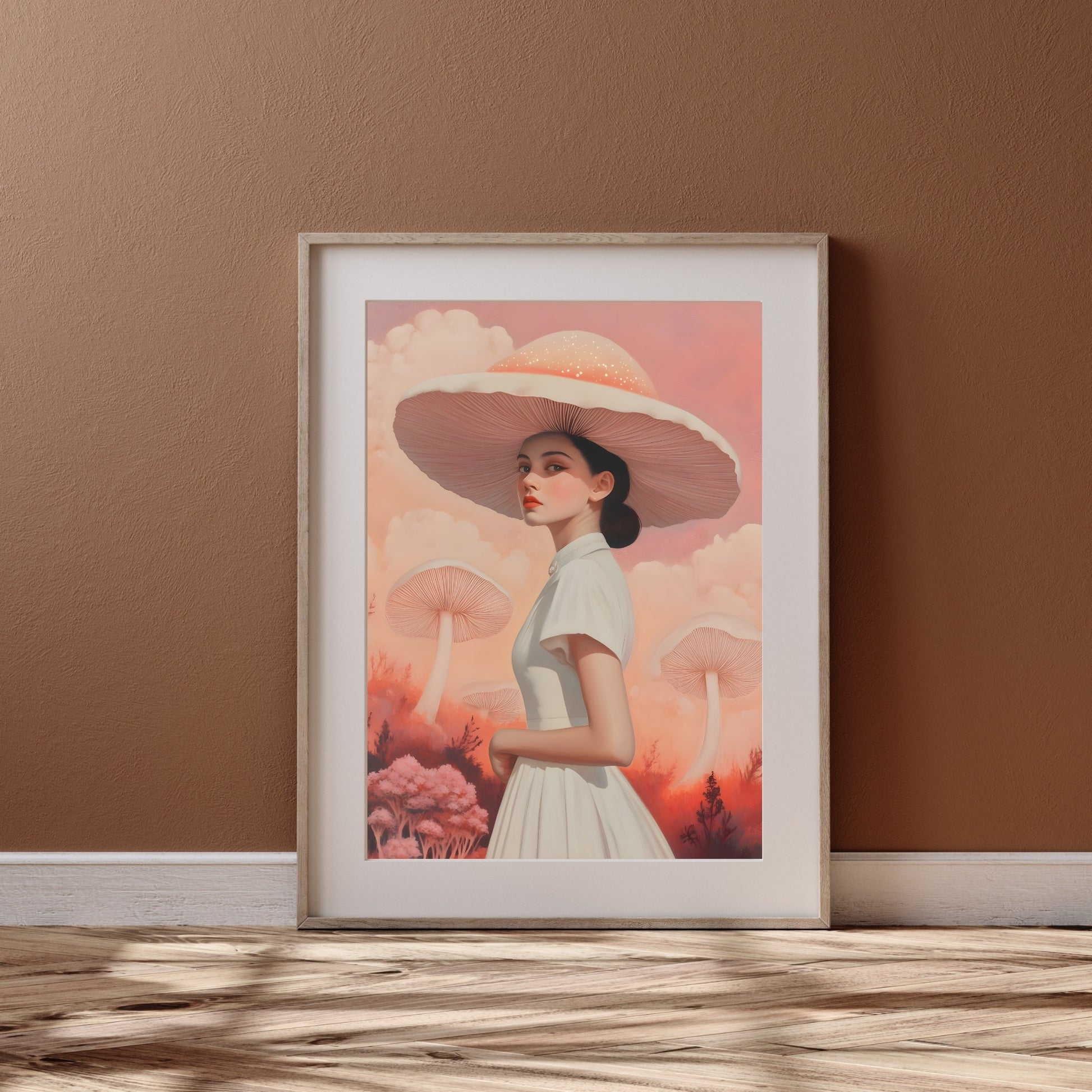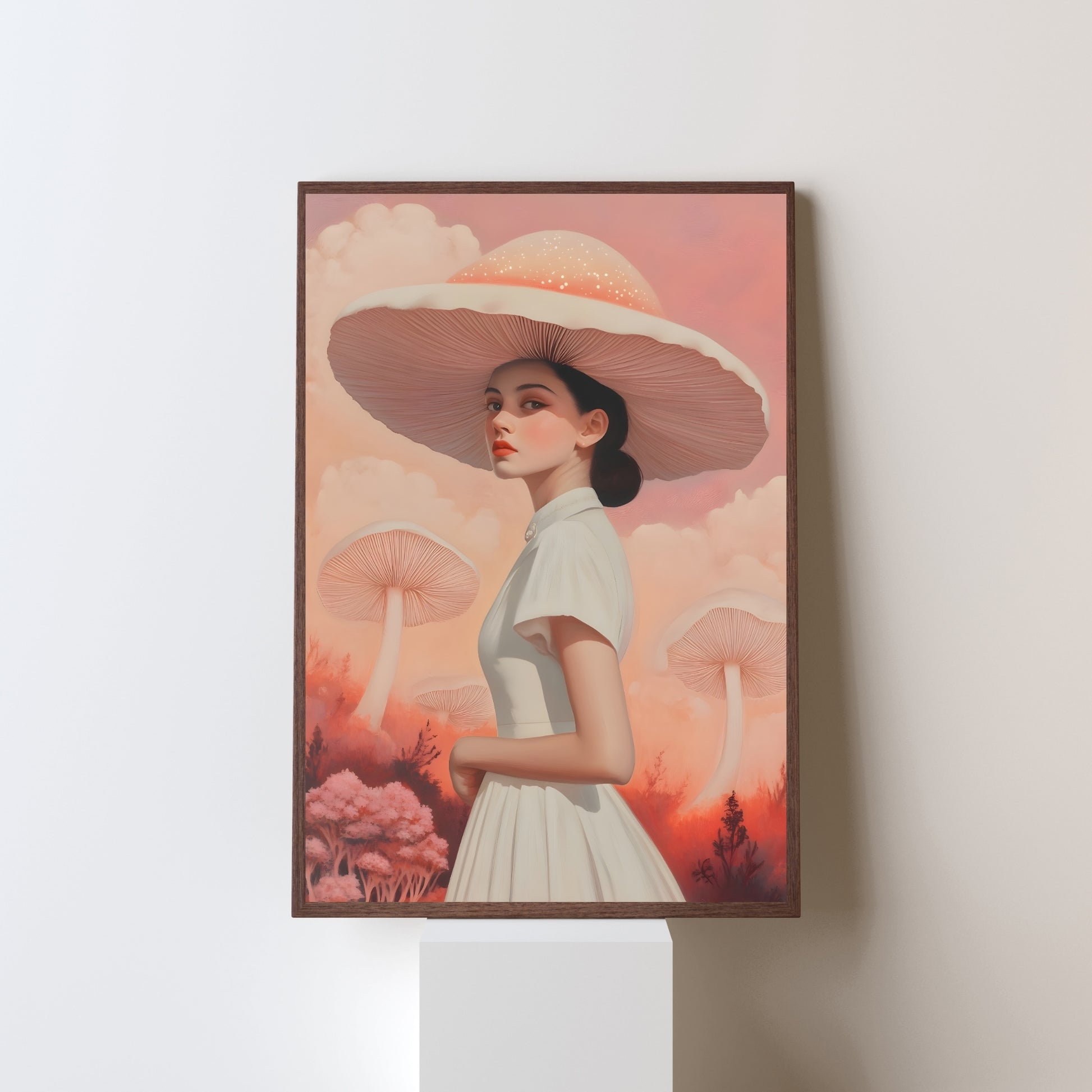 She appears as if she belongs to another realm, an embodiment of nature’s mysteries and magic. Her gaze invites you into a world where mushrooms rise like royal emblems, and the sky blends seamlessly with the earth in a gentle symphony of pastel hues. Her hat, resembling a graceful mushroom cap, is more than an accessory - it’s a symbol of her unity with the ancient secrets of the earth.