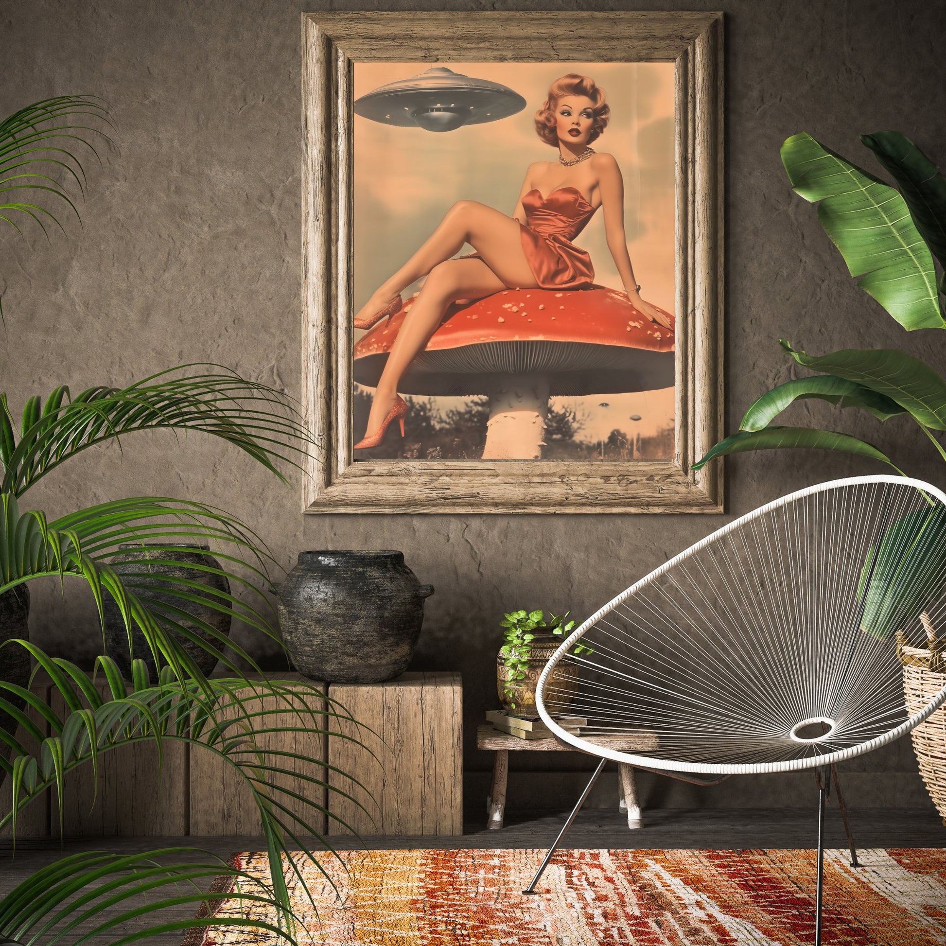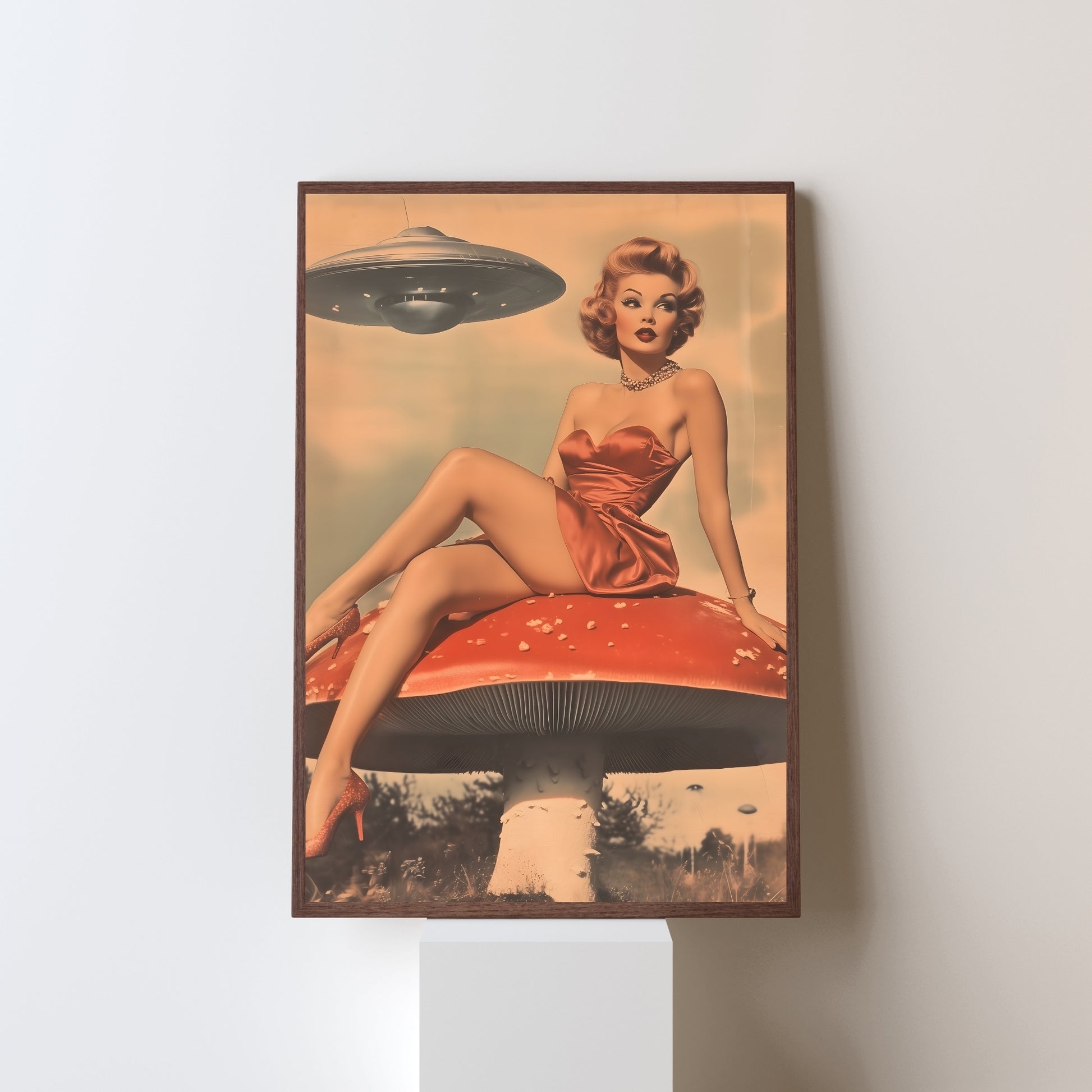 She descends like a vision from another dimension - part vintage Hollywood icon, part cosmic enigma. Draped in satin and confidence, she perches atop her throne of nature’s own magic, as if the universe itself rolled out the red carpet just for her. The UFO lingers, but she’s in no rush.