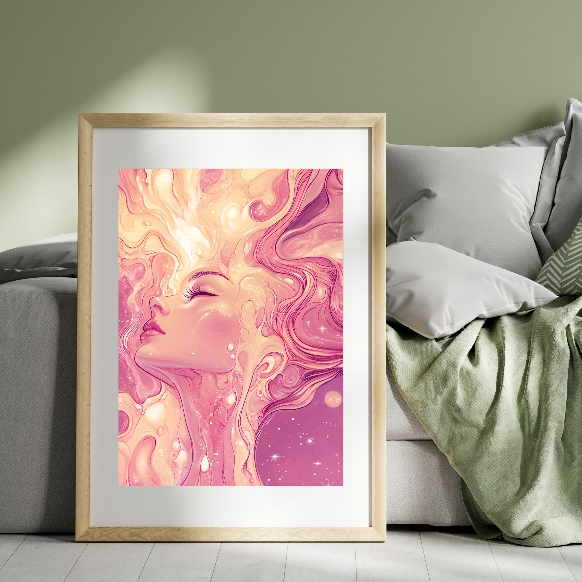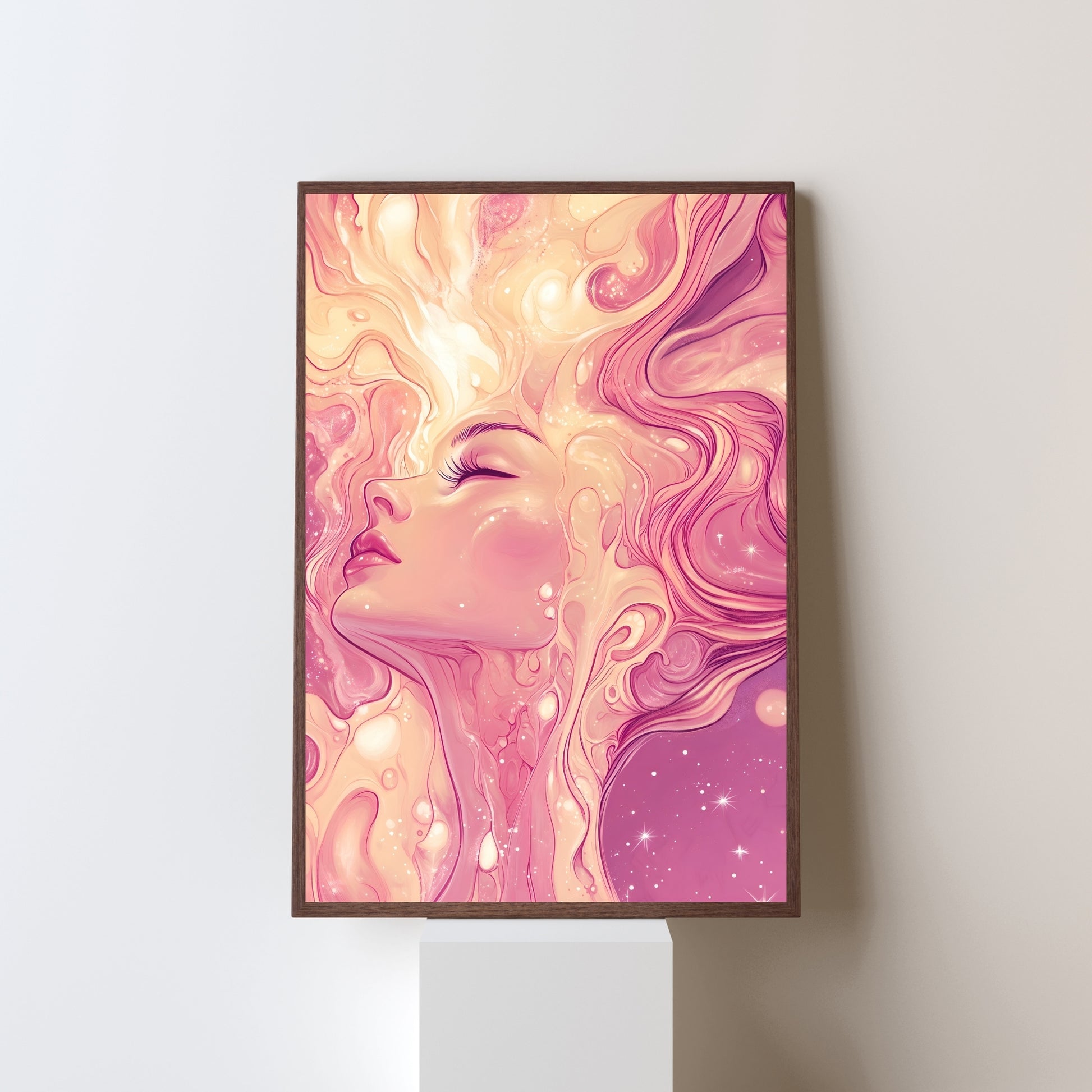A dreamscape where the boundaries of self dissolve into waves of celestial energy. Her form, fluid and infinite, melts into the cosmos, becoming one with the great expanse. The golden glow of enlightenment pulses through her, a reminder that the mind is not confined to the body - it is a current, an ever-flowing stream of consciousness merging with the stars.