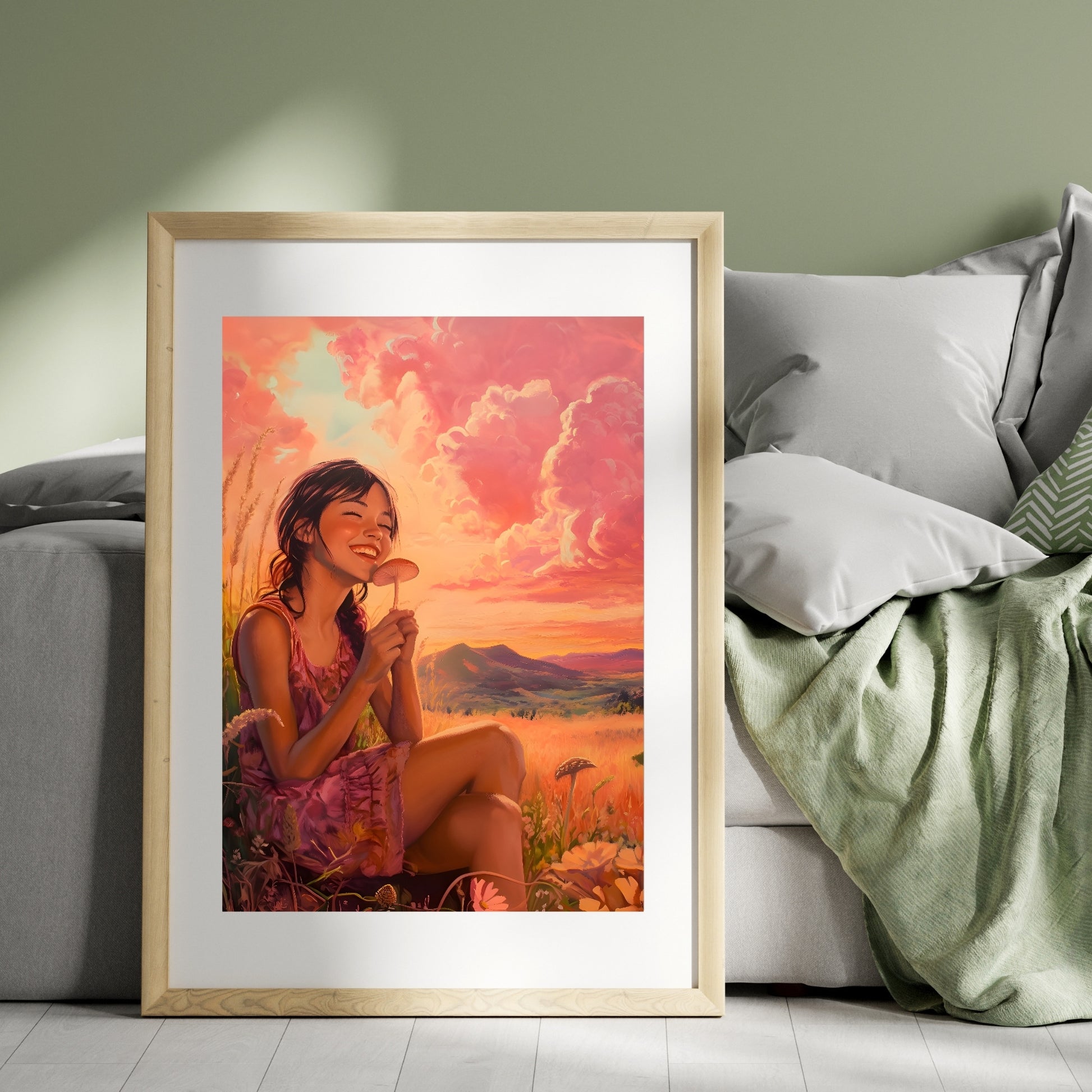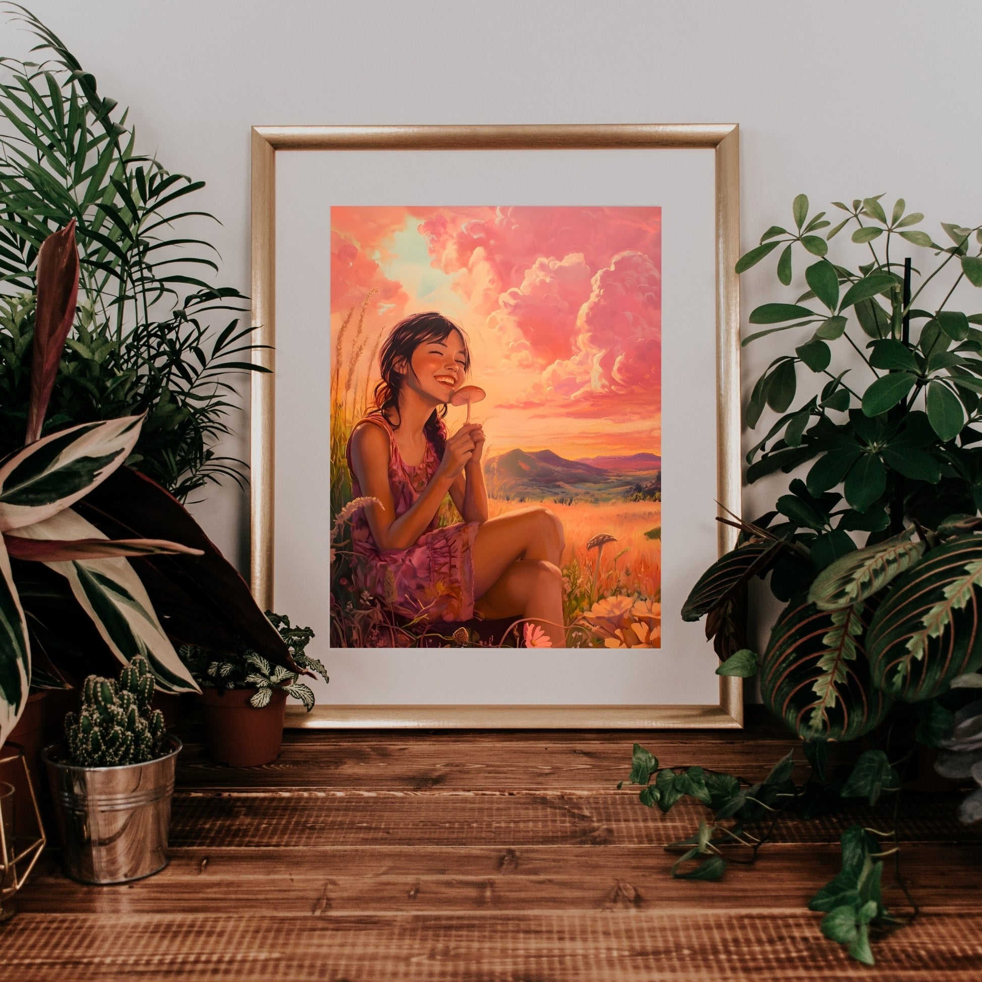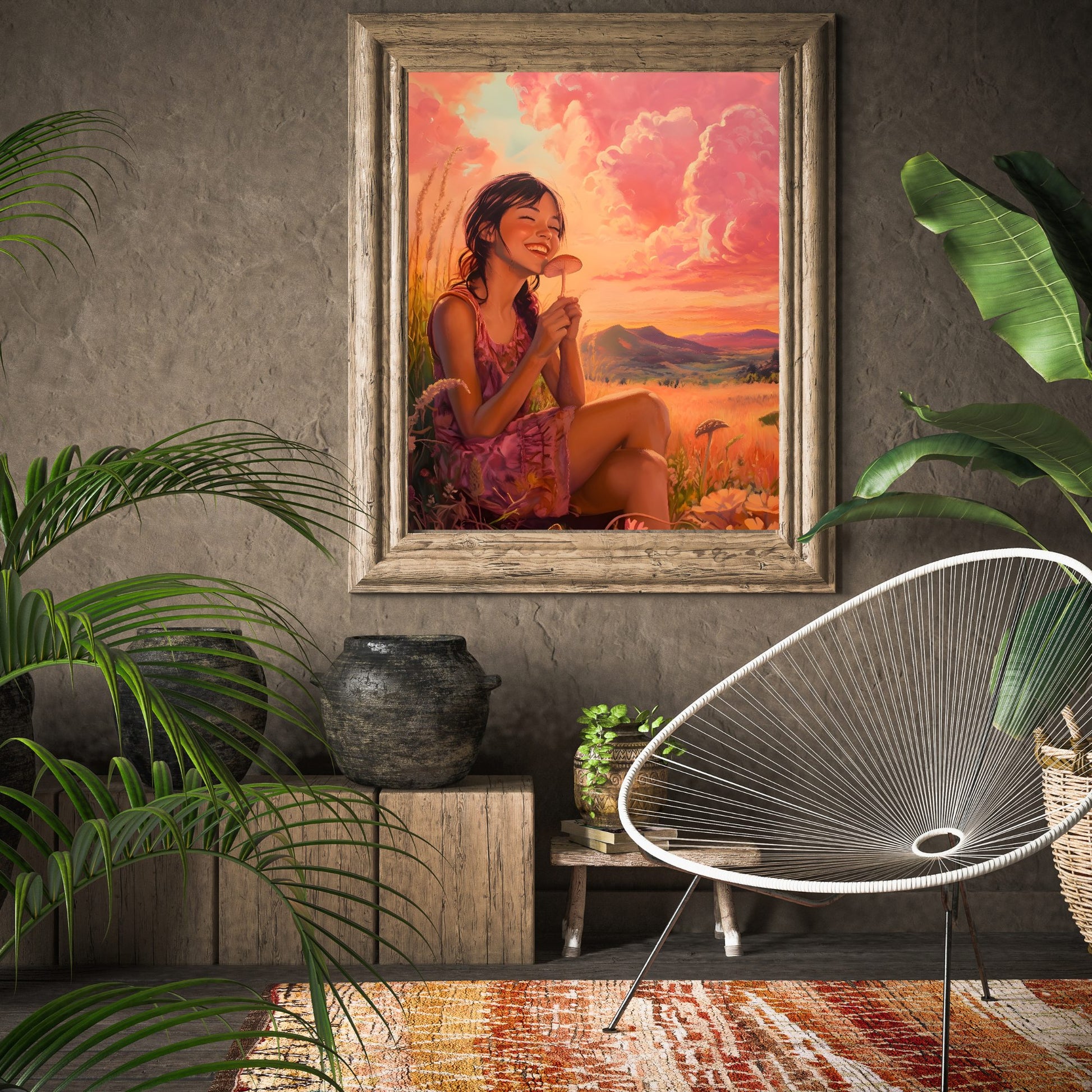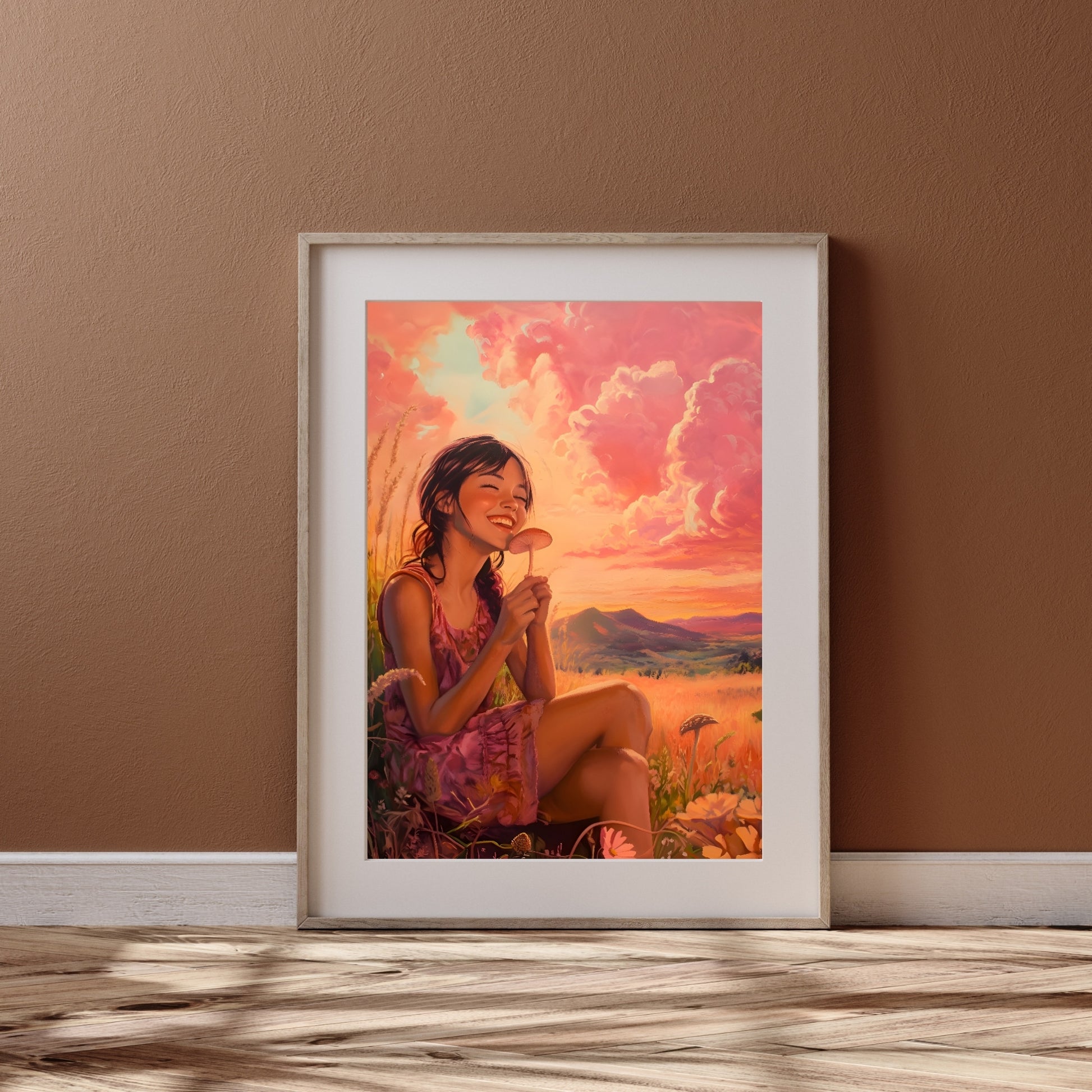 Beneath the golden rays of the setting sun, she feels the touch of eternity. The mushroom in her hands is more than nature’s creation; it’s a bridge between realities, a reminder that the world is full of mysteries waiting to be uncovered. For some, it’s a simple piece of the earth, but for others, it’s a symbol of profound connection - a fleeting moment when the ground whispers its ancient secrets. Her smile says more than words ever could, hinting at journeys within and beyond the ordinary. In this field, under a sky where the sun meets the clouds, lies a magic only visible to those who know how to see beyond the surface.