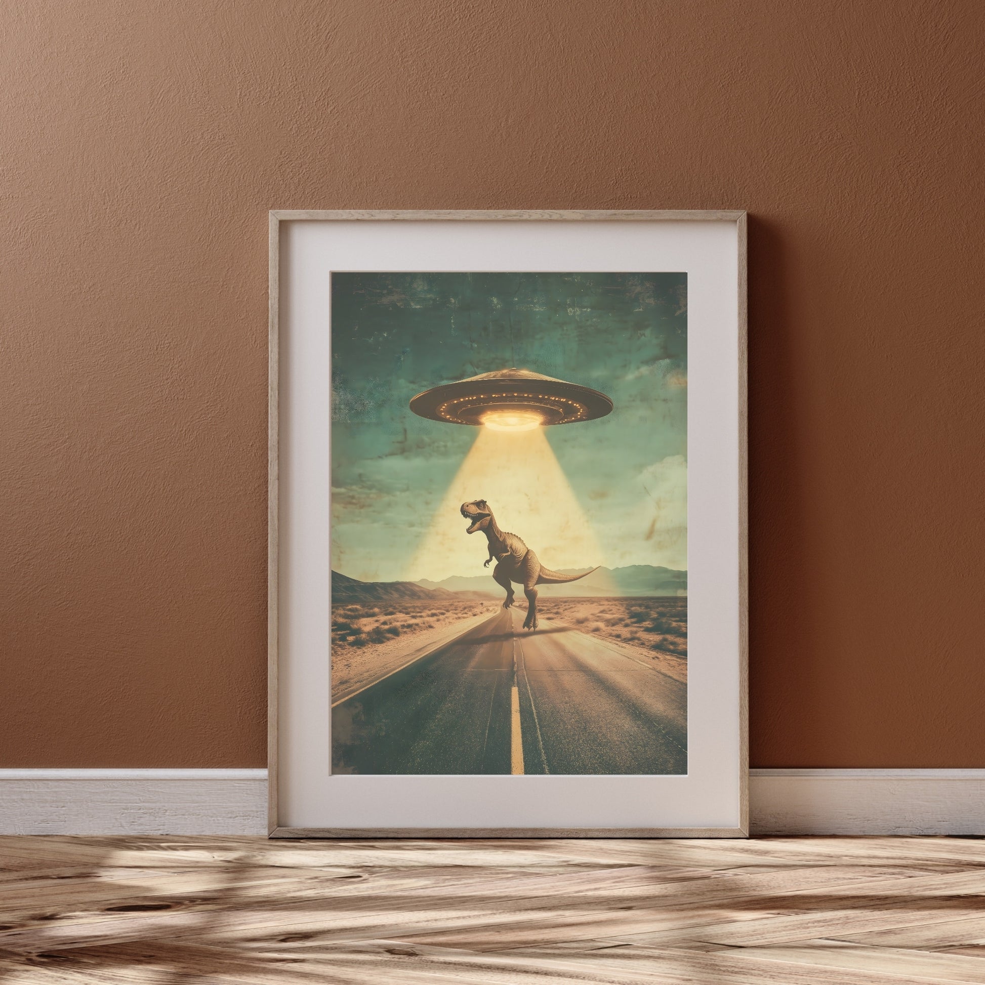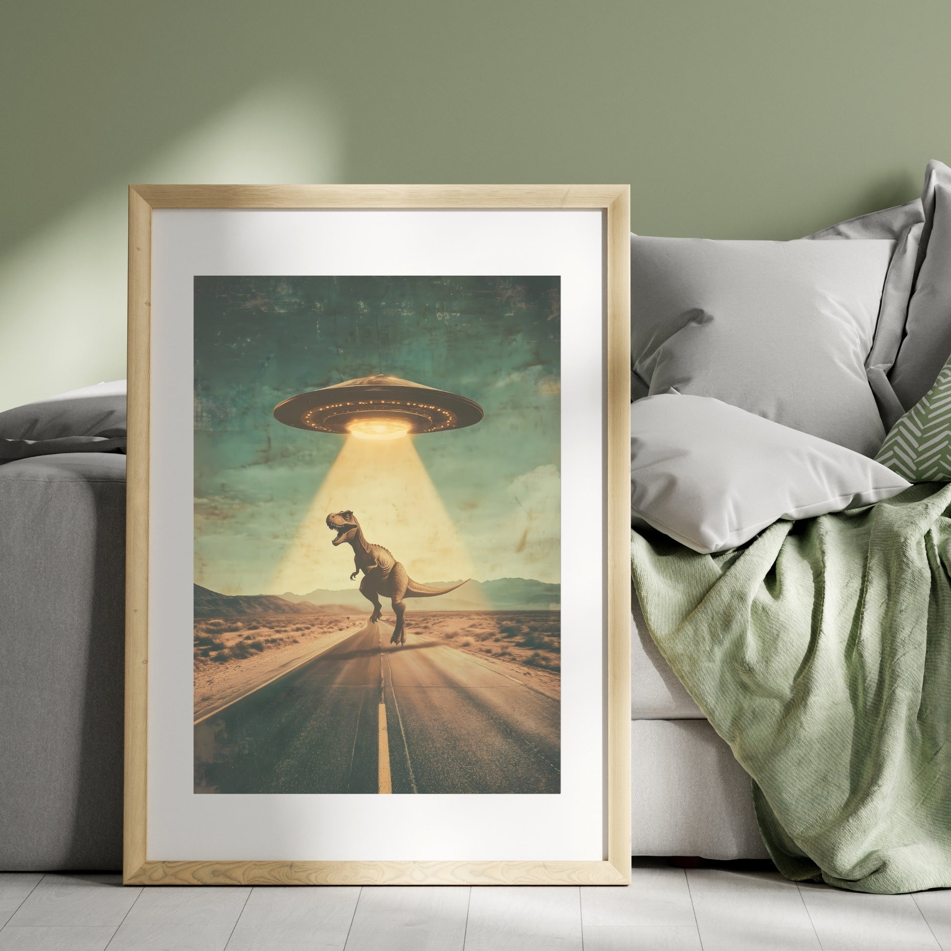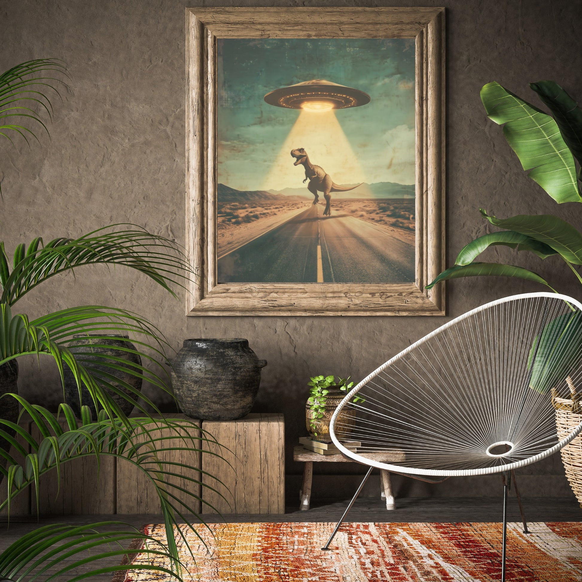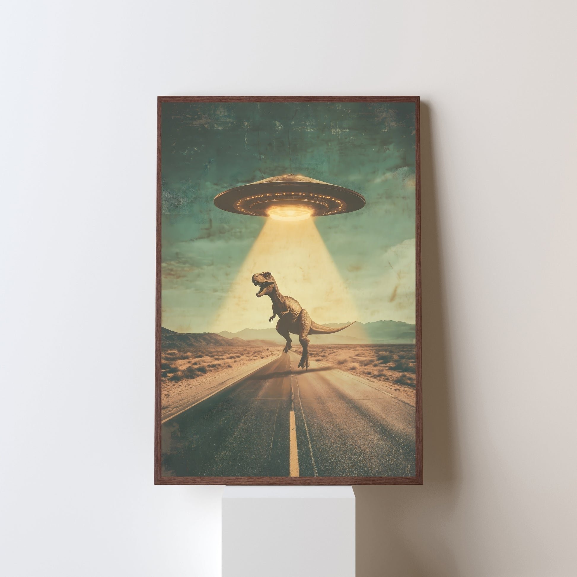 A surreal, retro-futuristic piece that blends the prehistoric with the extraterrestrial. Perfect for lovers of sci-fi, dinosaurs, and all things wonderfully bizarre.